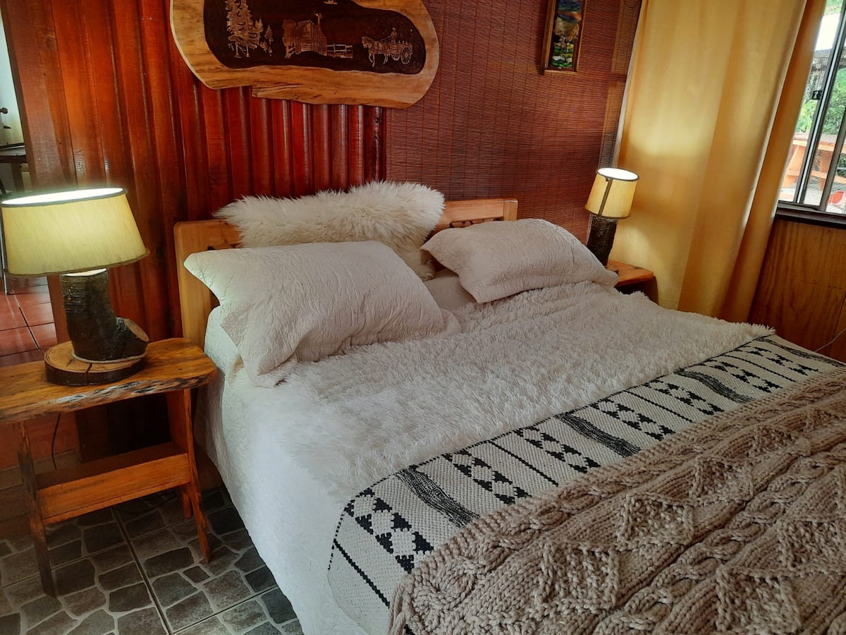 Disfruta de una cabaña acogedora, rodeada de naturaleza y tranquilidad. Cuenta con 3 habitaciones cómodas, 1 con cama matrimonial y las otras dos con cama de 1.5 plaza en cada una. La cocina está totalmente equipada. Para invierno tenemos combustión lenta a leña y estufa a gas. Este espacio es ideal para desconectar. Relájate en su entorno natural y vive una experiencia única, perfecta para familias, parejas o aventureros. ¡Despierta con vistas a la montaña y respira aire puro!