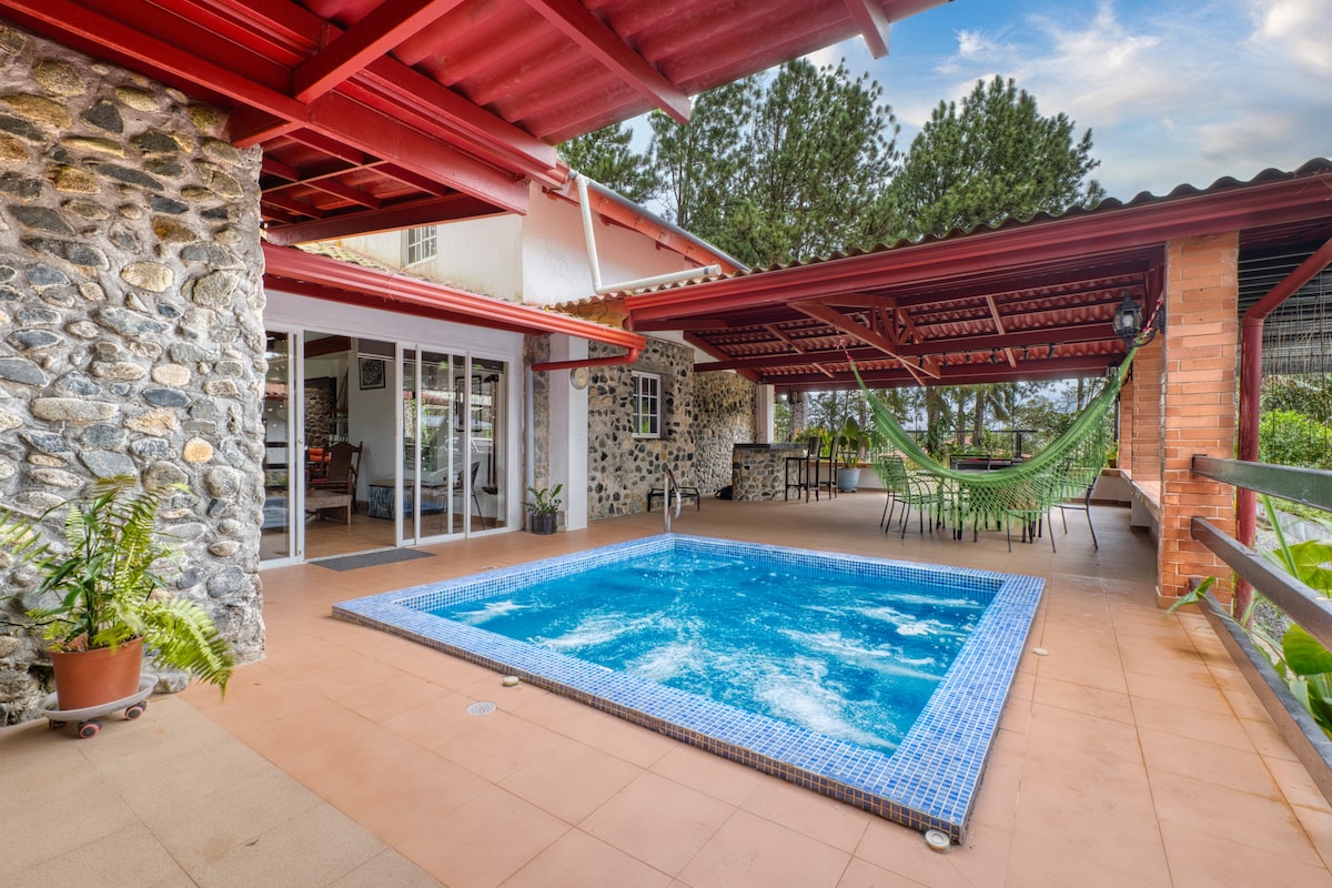 Άνετο σπίτι στο βουνό σε ιδιωτικό οικισμό με πισίνα και τζακούζι (το τελευταίο θερμαινόμενο) που περιβάλλεται από δέντρα, δροσερό κλίμα, εκπληκτική θέα και διαφορετικούς χώρους για να χαλαρώσετε, αποτελείται από δύο δωμάτια και ένα ανεξάρτητο διαμέρισμα, όλα μόνο για εσάς, εύκολη πρόσβαση, διαμονή για 7 άτομα, επισκεφθείτε ποτάμια, καταρράκτες, μονοπάτια, ιδιωτικό δρόμο προς την κοιλάδα του Αντόν.