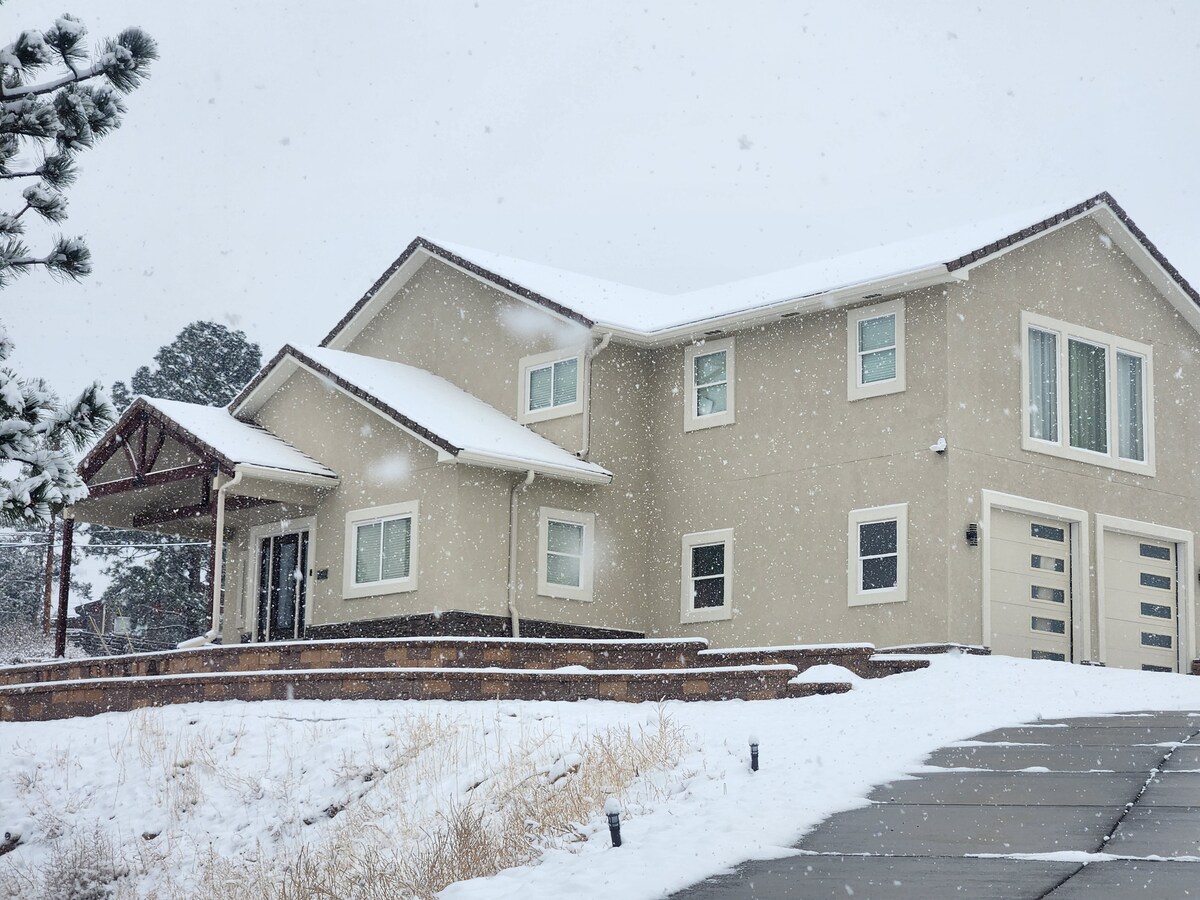 Modern meets mountain in this gorgeous getaway. Amazing views of “Purple Mountains Majesty”, Pikes Peak, as referenced in the famous anthem. All VIEW pictures taken from the deck! Sledding, and snowshoeing/cross country skiing!! -HOT TUB ⇹ PLAY GROUND ⇹ GAME ROOM: Air Hockey, Ping Pong, Foosball, Pool Table, and Corn hole. ⇹ Luxury Shower: 6 heads & heated floors ⇹ Pleasant Outdoor indoor spaces w/ firepit. ⇹ Activities: See Guidebook, my pictures, or TripAdvsior. -Complimentary Snow removal