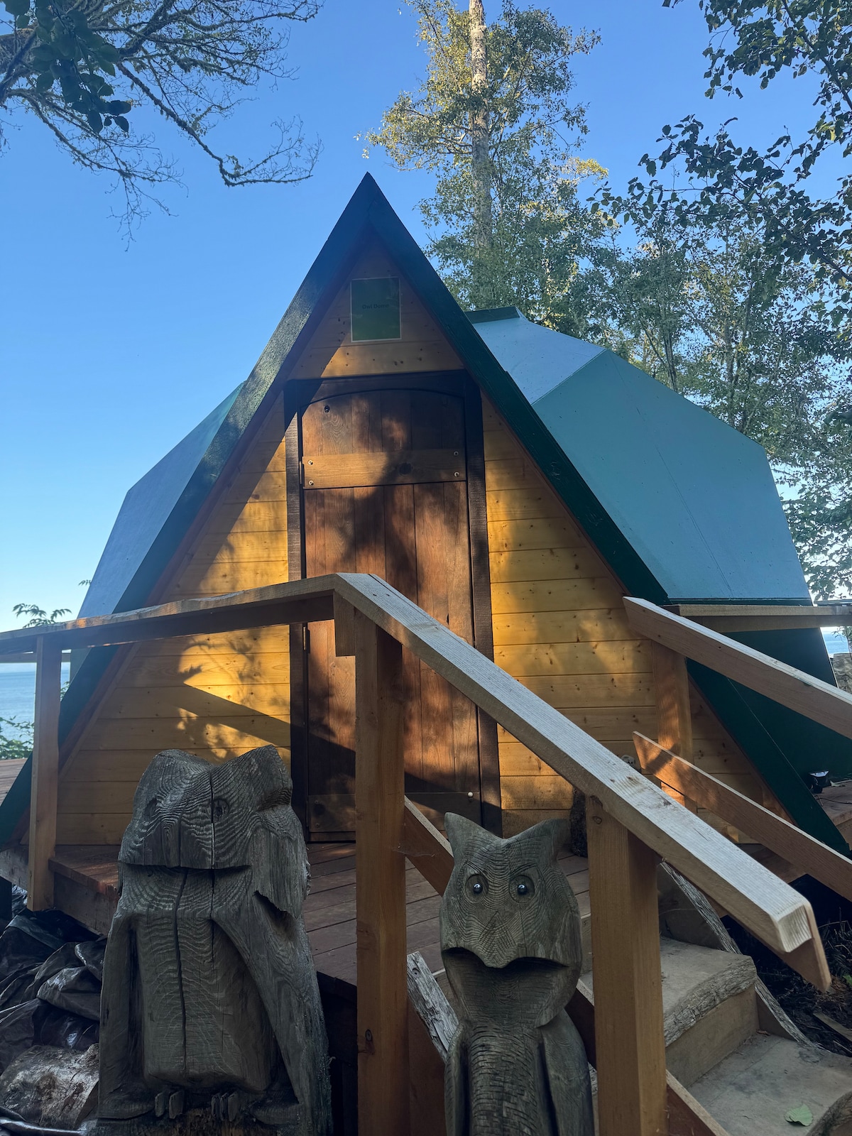 The Owl Dome is the perfect launch pad for your adventures! This one of a kind custom build wood Geodesic Dome offers unparalleled views of the Strait from your private deck and from within the dome! Gaze at stars through and on a clear day get a direct view of Mt. Baker! Featuring solar powered lighting, fans and charging station. This is a rough and rustic, newly built dome. There are still some minor finishing touches to be added but we’re excited to welcome guests to this amazing space!