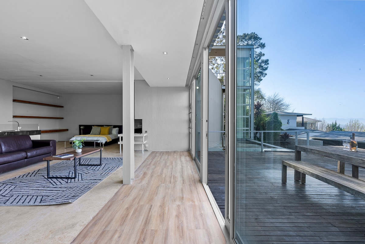Το στούντιο διαμέρισμά μας ανοίγει σε ένα μπαλκόνι 40 τετραγωνικών μέτρων με πανοραμική θέα στην κοιλάδα Hout Bay και τα βουνά Helderberg. Οι μεγάλες συρόμενες πόρτες εξαφανίζονται στους τοίχους δημιουργώντας μια ανεμπόδιστη εσωτερική/εξωτερική ροή, ενώ η υπερυψωμένη θέση προστατεύει την ιδιωτικότητά σας. Το μπάνιο ανοιχτού τύπου βλέπει σε έναν κλειστό μυστικό κήπο που περιλαμβάνει ένα γυάλινο ντους χωρίς πλαίσιο. Το κατάλυμα διαθέτει πλήρως εξοπλισμένη μικρή κουζίνα και εξυπηρετείται καθημερινά εκτός Σαββατοκύριακων και αργιών.