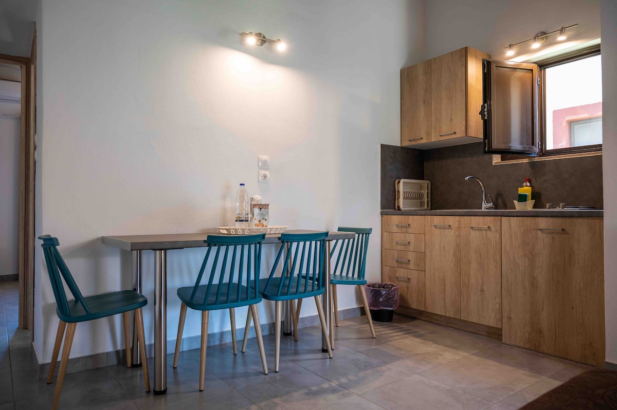 Το διαμέρισμα είναι διχωρο και απαρτίζεται από ένα υπνοδωμάτιο με ένα διπλό κρεβάτι και έναν ακόμα χώρο ενιαίο με δυο κρεβάτια και στον ίδιο χώρο μια επιπλωμένη κουζίνα. Είναι ισόγειο με δίκη του ατομική βεράντα. Στο χώρο υπάρχει πισίνα,παιδική χαρά,κοινόχρηστο πληντρυριο πιάτων,τέννις και μπάρμπεκιου. Η παραλία είναι στα 100 μέτρα με τα πόδια και στα 500 μέτρα από τπ χωριό Δρεπανο.