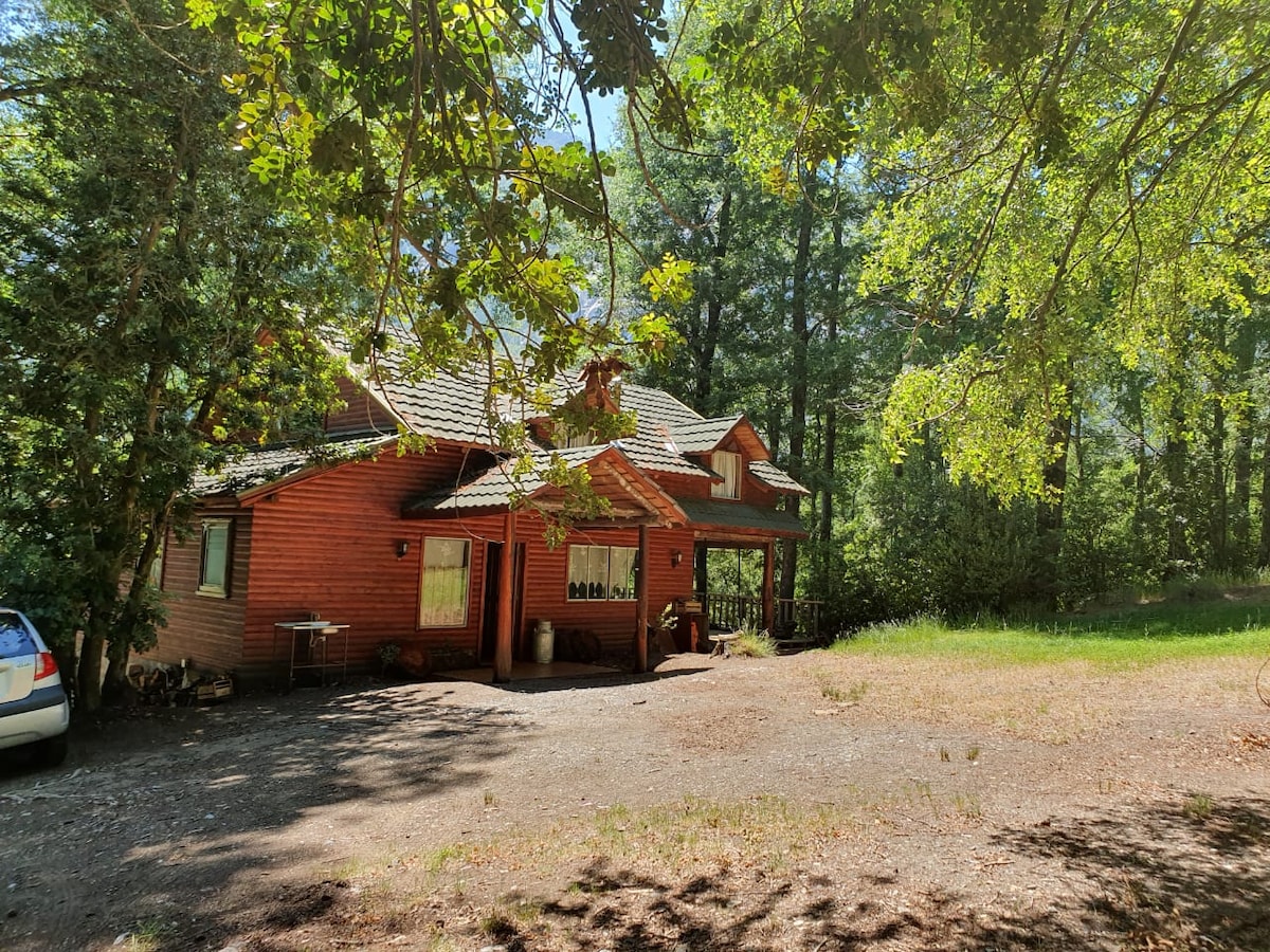 The cabin has a natural feel and rustic touch within amazing surroundings of the native forest and trees all around you. The cabin has been built with native and sustainable wood. it is well equipped. Is very cute and cozy space with a large veranda with an outdoor seating. There is a nice river with access within the property with a picnic table next to it to enjoy listening the river. Big sunny green garden, picnic table to enjoy the view of the mountains, a fire-pit and couple of hammocks.