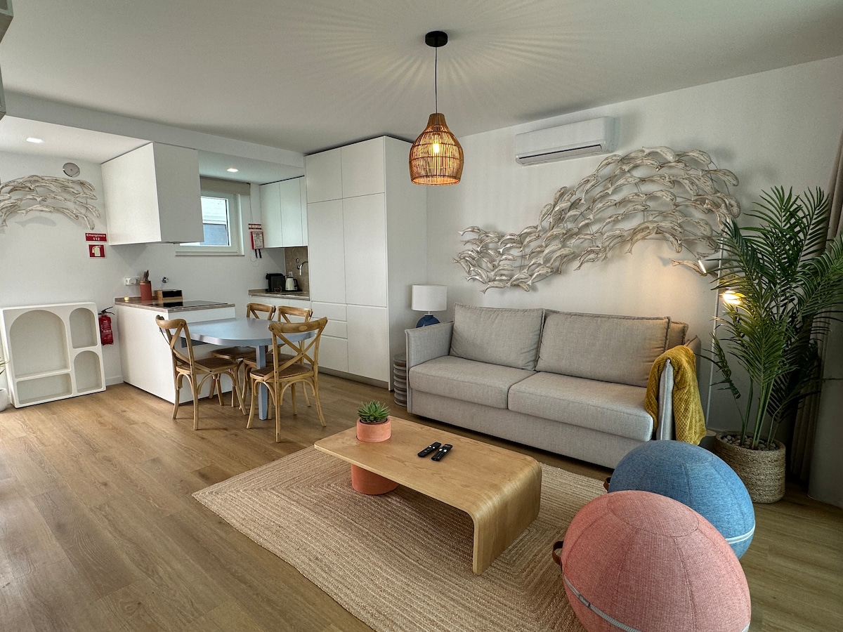 Apartamento reconstruído por arquitecto, excelente privacidade, exposição solar, com wifi, e praia a 150m. 1 suite com SPA e banho turco com aromaterapia. 1 suíte com terraço com vista mar, tela de projeção de cinema. Sala com vista de mar, rio, e terraço, onde poderá disfrutar de uma zona de estar e de um barbecue com grelha em ferro forjado. Perto de restaurantes, cafés e supermercado, e estação de comboio. Ar condicionado e piso aquecido em todas as áreas, TV 4K e box independente por suíte.