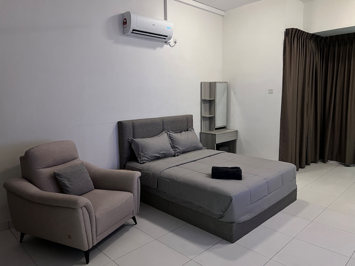 Cozy and fully furnished modern studio with 1 queen bed, a comfy sofa bed, refrigerator, washing machine, and TV with local channels. Enjoy peace of mind with reliable and experienced security on-site. 5 mins to Angsana Mall or Paradigm Mall 15 mins to CIQ/JBCC (via Woodlands) 20 mins to Legoland Malaysia, IKEA, Toppen, or AEON Tebrau 20 mins to 2nd Link CIQ (via Tuas) Perfect for a quick getaway or a convenient stay!