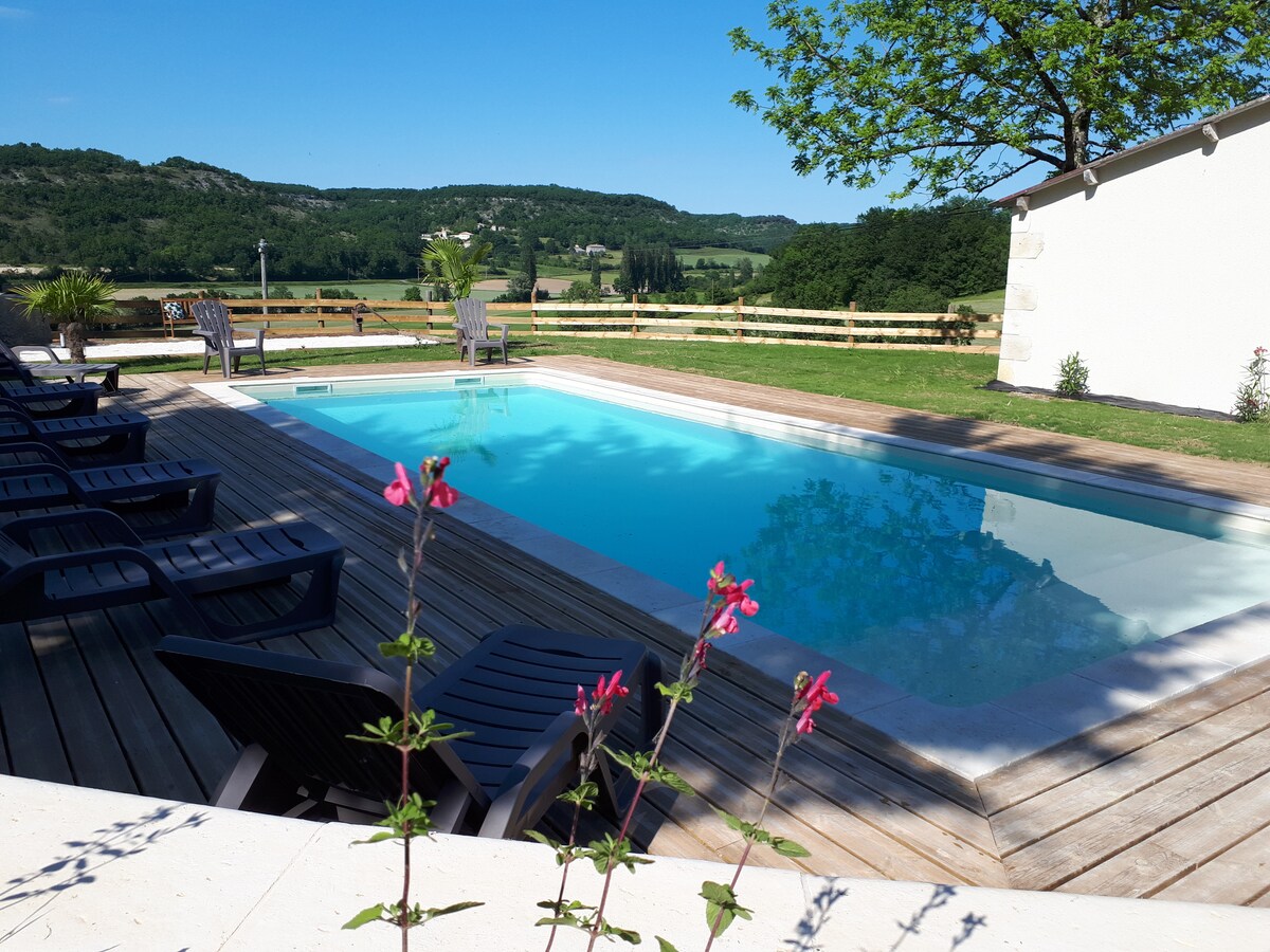 Εξοχικό σπίτι σε αχυρώνα με θέα σε δύο κοιλάδες στην ύπαιθρο. Βρίσκεται στα σύνορα των Lot-et-Garonne, Lot και Tarn-et-Garonne και κοντά στη Dordogne. Μεγάλη πισίνα 10mx5m Μεγάλο σαλόνι με εξοπλισμένη κουζίνα (επαγωγική εστία, φούρνος με λειτουργία πυρόλυσης, πλυντήριο πιάτων, φούρνος μικροκυμάτων, καφετιέρα, ψυγείο + καταψύκτης) Καθιστικό με γωνιακός καναπές 3 υπνοδωμάτια, 2 μπάνια και 2 τουαλέτες Γυμναστήριο Τηλεόραση Wi-Fi Πλυντήριο ρούχων Βεράντα με όμορφη θέα στις κοιλάδες