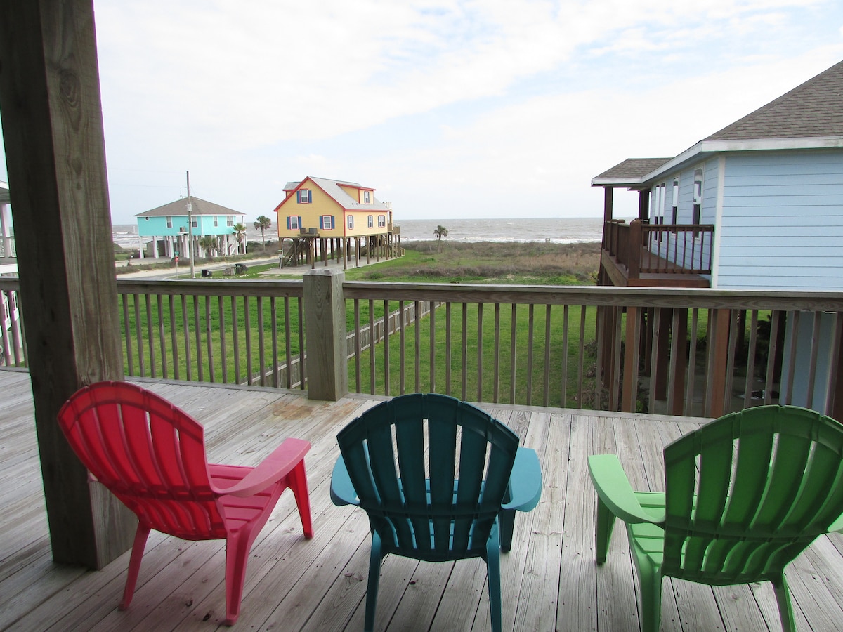 Unobstructed ocean views! See all the way down the beach to Galveston. Four bedrooms and 3 1/2 baths. Plenty of space and several decks for enjoying the sun. You have space to entertain, inside the beach home , but also underneath where you will find a large built in bar, propane/charcoal bar b q , swings, hammock loft and outdoor shower. Fenced in yard. Private walkover to the beach. Gourmet kitchen with butlers pantry. Tv's in every room. Master has soaking tub with beach view! Sleeps 14