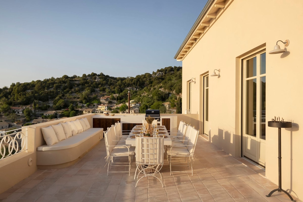 Savour the easy pleasure of island life at this serene Greek estate. Its surrounding landscape is rich with dense shrubbery and cypress trees that provide a natural shield of privacy. After dark, strategically placed lights illuminate the rugged stone façade, glass accents, and terracotta roof. The Ionian Sea is just beyond the backyard—why not charter a private yacht to cruise the coast in style? Two separate, equally stunning villas makeup Viva La Diva and both feature spectacular views of the Mediterranean-inspired garden. A dichotomy is created between old and new, offering a charming aesthetic to the interior. Rocky arched doorways lead from one room to another while faded hardwood floors flow throughout. An airy ambiance inside is achieved by towering vaulted ceilings and broad glass doors that disappear into the walls, opening up the living area and expanding the space onto the sun-drenched terrace. As you sip your morning coffee, perhaps catch a gull flying overhead or listen to the calming wind rustling through fragrant olive groves nearby. The heated infinity pool provides just the right amount of refreshing invigoration after basking in the midday heat. Sink into a plump lounger with a chilled glass of champagne, poured at the beach bar, as you watch the horizon transform into dusk. Either opt to feast on charcoal-grilled souvlaki in the solarium-style dining room or take your meal alfresco to enjoy an enveloping salt-infused breeze and a romantic, candlelit experience. Beneath the covered patio, a vintage Brunswick billiards table encourages friendly competition. Copyright © Luxury Retreats. All rights reserved. BEDROOM & BATHROOM • Bedroom 1 - Primary: King size bed, Ensuite bathroom with stand-alone shower, Walk-in closet, Television, Safe, Terrace • Bedroom 2: King size bed, Ensuite bathroom with stand-alone shower, Television, Terrace, Ocean view • Bedroom 3: King size bed, Ensuite bathroom with stand-alone shower, Television, Safe, Ceiling fan, Terrace • Bedroom 4: King size bed, Ensuite bathroom with stand-alone shower, Television, Terrace • Bedroom 5: King size bed, Ensuite bathroom with stand-alone shower, Television, Balcony • Bedroom 6: King size bed, Shared access to hallway bathroom, Bathtub, Television, Safe, Balcony • Bedroom 7: King size bed, Shared access to hallway bathroom, Stand-alone shower, Television, Terrace STAFF & SERVICES Extra Cost (advance notice may be required): • Activities and excursions • Linen change - twice per week • Gardener • More under “Add-on services” below