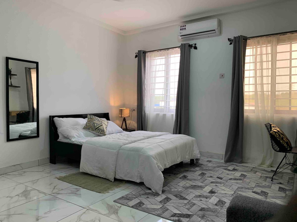Καλώς ήρθατε στην πολυτελή αστική απόδρασή σας στην πόλη της Άκρα! Με εκπληκτική θέα στα βουνά Aburi, μόλις λίγα λεπτά με το αυτοκίνητο ή 15 λεπτά με τα πόδια. Λιγότερο από 12 μίλια από το αεροδρόμιο, κατευθείαν στον M4 χωρίς στροφές. Το διαμέρισμά μας με τα δύο υπνοδωμάτια προσφέρει χαρά και άνεση με 24ωρη ασφάλεια, 24ωρη ηλεκτρική ενέργεια και νερό, με αποκλειστικές παροχές, όπως πισίνα, βεράντα στην ταράτσα, μοντέρνο γυμναστήριο, πλήρη κουζίνα, wifi, μπάρμπεκιου και πολλά άλλα που θα κάνουν τη διαμονή σας πραγματικά αξέχαστη.