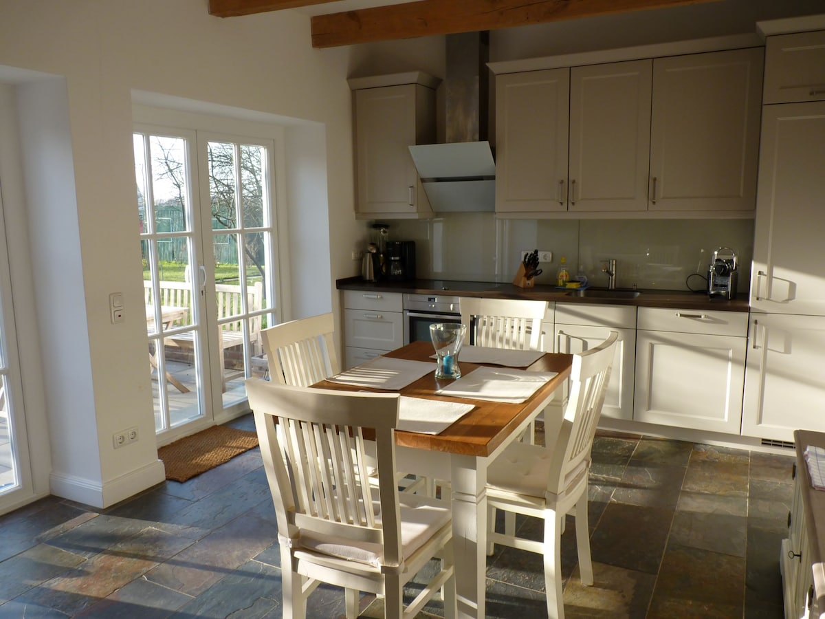 Willkommen in unserem traumhaften und ruhigen Feriendomizil - nur 4km von der Ostsee entfernt. Mitten in unserem wunderbaren Obstgarten steht unser geräumiges Haus mit einer gemütlichen Wohnküche, in der bei kaltem Wetter ein Kaminofen für Gemütlichkeit sorgt. Im Sommer lädt die große Terrasse mit einem schattenspendenden Apfelbaum zum gemeinsamen Essen ein. Im liebevoll ausgebauten Nebenhaus befindet sich eine Sauna mit Bad und Dusche und einem idyllischen Ruhebereich mit Aussendusche.