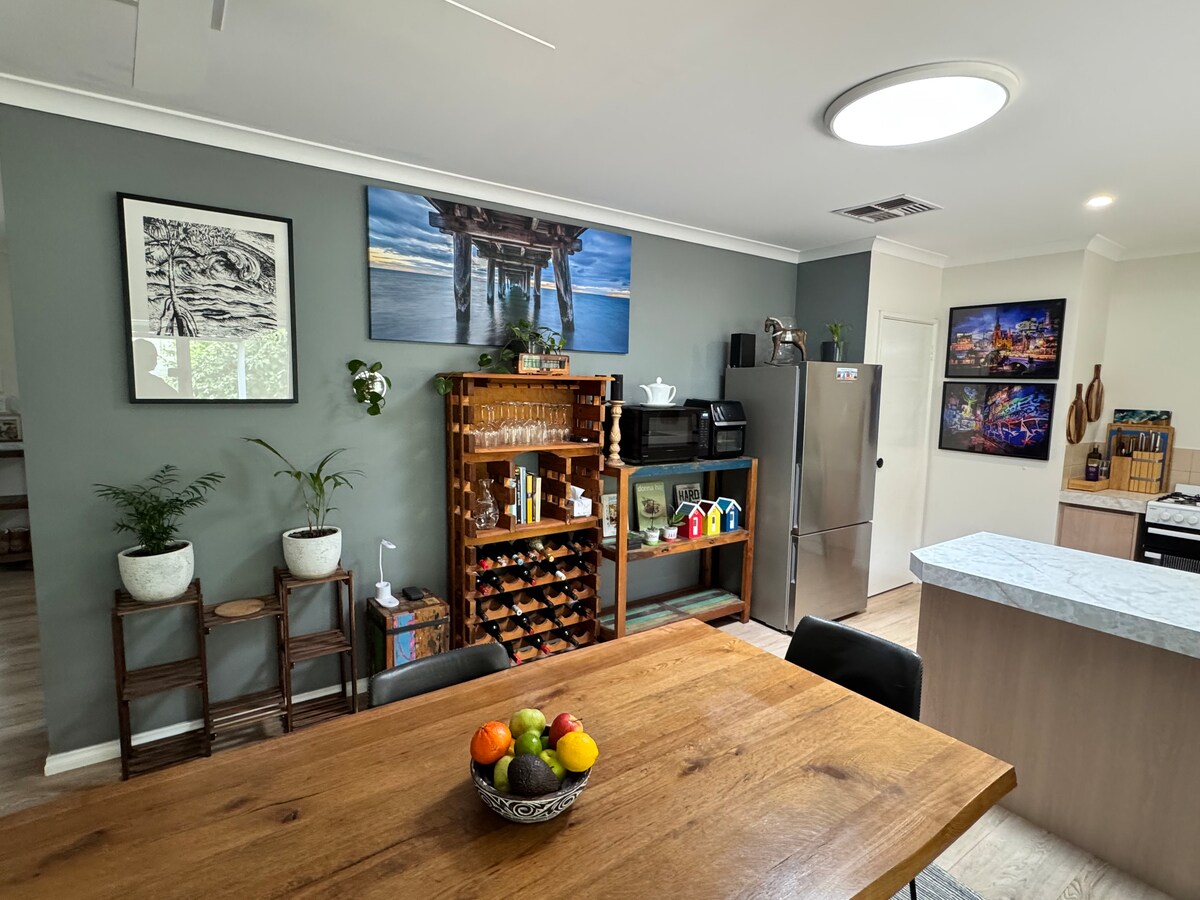 Υπέροχο καταφύγιο στην παραλία για να χαλαρώσετε, μόλις μία ώρα νότια του Περθ. Διαθέτει 4 δίκλινα υπνοδωμάτια που μπορούν να φιλοξενήσουν εύκολα 8 ενήλικες και περισσότερους αν χρησιμοποιήσετε τον καναπέ-κρεβάτι. Παρέχονται όλα τα κλινοσκεπάσματα και οι πετσέτες μπάνιου. Πολλαπλοί χώροι όπου μπορείτε να χαλαρώσετε και να ηρεμήσετε. Μπροστινή βεράντα για να παρακολουθείτε τα καγκουρό τη νύχτα ή την πίσω βεράντα ψυχαγωγίας με μπάρμπεκιου και κρυφή περιοχή στο πίσω μέρος. Το σπίτι μας για οικογενειακές διακοπές, όχι ένα νέο ξενοδοχείο, αλλά το λατρεύουμε! 6 λεπτά με τα πόδια από την παραλία. Λάβετε υπόψη ότι δεν δεχόμαστε κρατήσεις για σχολικές εκδρομές.