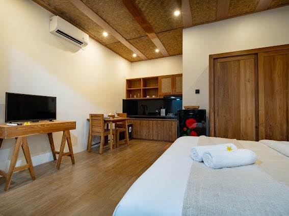 Καλωσορίσατε στο ήσυχο και κεντρικό στούντιο μας στο όμορφο Μπαλί! Βρίσκεται σε μια γαλήνια γειτονιά, ενώ είναι βολικά κοντά σε σούπερ μάρκετ και άλλα καταστήματα, διασφαλίζοντας ότι όλες οι ανάγκες σας είναι εύκολα προσβάσιμες. Μια σύντομη διαδρομή θα σας μεταφέρει σε εκπληκτικές παραλίες όπως η Κούτα, το Σεμινιάκ ή το Κάνγκου, όπου μπορείτε να απολαύσετε τον ήλιο και το σέρφινγκ. Το διαμέρισμα διαθέτει ένα άνετο κρεβάτι queen-size. Η πλήρως εξοπλισμένη ιδιωτική μικρή κουζίνα σάς επιτρέπει να ετοιμάζετε τα γεύματά σας όποτε το επιθυμείτε.