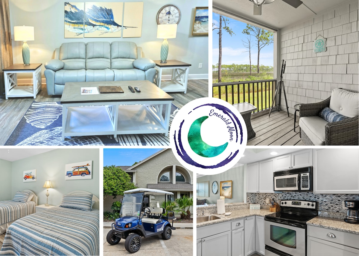 "Emerald Moon" is a beautiful 2 bed, 2 bath main-floor condo in the heart of Sandestin® Golf and Beach Resort! Close to everything - cart or walk to Baytowne Wharf and Grand Blvd. King in main and 2 twin beds in guest room. Complete with a full kitchen, and washer/dryer in unit! BRAND NEW (2026) leather living room furniture is pictured - pro photos coming soon! PLEASE READ OUR REVIEWS on our other properties in addition to the ones here.