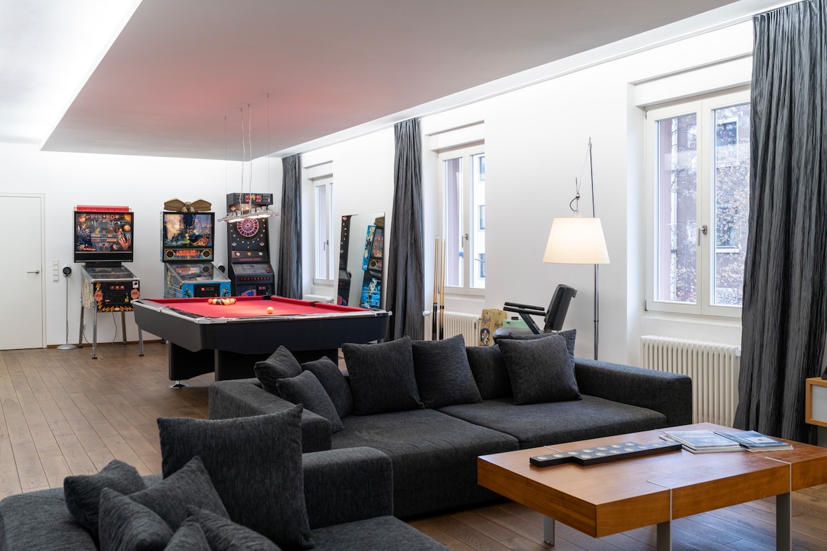 Οικογενειακός παράδεισος σε σοφίτα με αίθουσα παιχνιδιού και κήπο