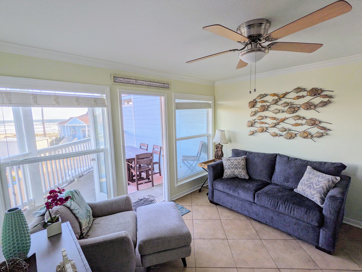 Πρόσφατα ανακαινισμένο με μια ζεστή αίσθηση παραθαλάσσιου εξοχικού. Το διαμέρισμά μου είναι ΣΤΗΝ ΠΑΡΑΛΊΑ. Μην διασχίζετε τον πολυσύχναστο αυτοκινητόδρομο με την οικογένειά σας. Χώρος για 6 άτομα. Ρυθμιζόμενο κρεβάτι queen size και καναπές-κρεβάτι queen size με 2 κουκέτες. Νέα κουζίνα, 2 τηλεοράσεις επίπεδης οθόνης. Δωρεάν WiFi και Netflix. Το συγκρότημα διαθέτει μεγάλη θερμαινόμενη τροπική πισίνα με 3 υδρομασάζ. Ιδιωτική πρόσβαση στην πισίνα και την παραλία. Το ακίνητο είναι περιφραγμένο με ασφάλεια. Ένα χρηματοκιβώτιο για την αποθήκευση των τιμαλφών σας είναι δωρεάν για τη χρήση σας. 10 λεπτά από το Moody Gardens ή το Pleasure Pier. Ράμπες για άτομα με ειδικές ανάγκες