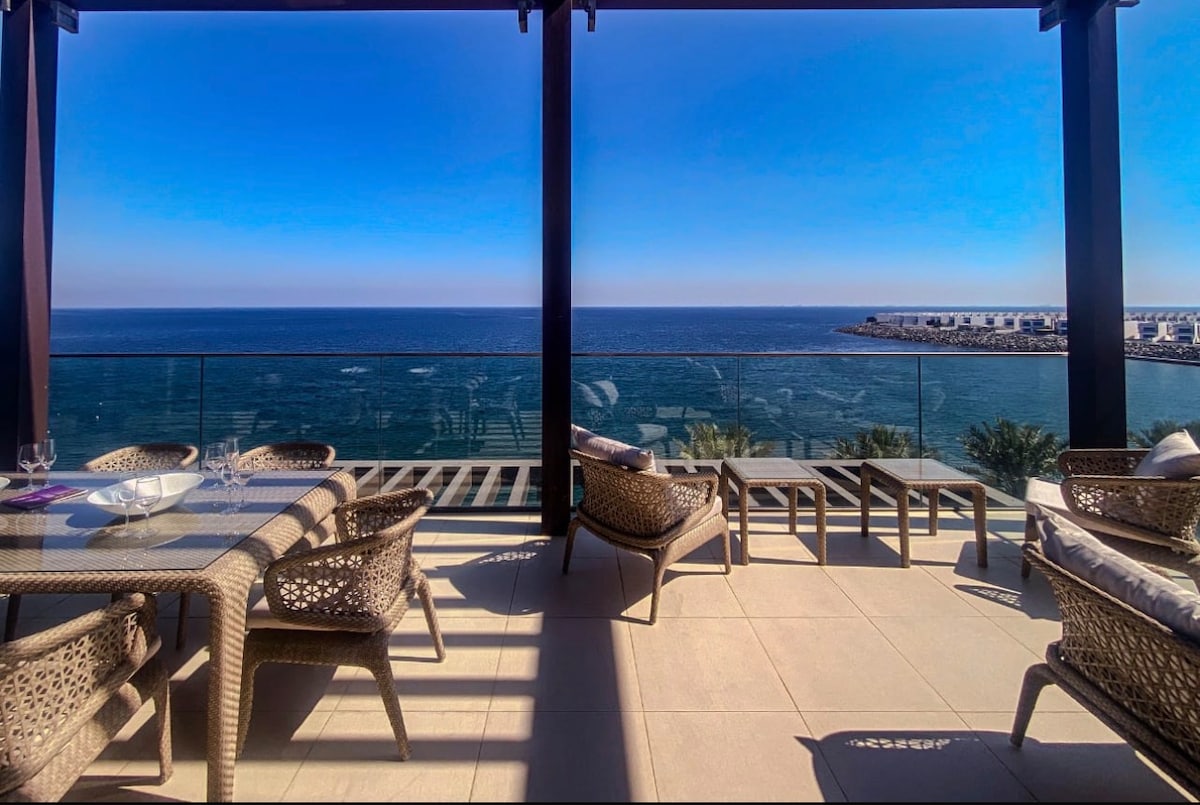 Fully renovated one-br suite steps from the free Beach, Golf course, Marina and close to luxury hotels Ritz Carlton, Waldorf, Hilton. 20 m. drive to Hajar Mountains. 24 hours Concierge/lockbox access. Free Parking. Free: Gym, pool ,kids pool and 2 kids play areas . Gorgeous large terrace with lounge seating and full sea view. Sleeping: 1 King size bed+ 2 sofa beds. Kitchen: cooker, w/machine, Fridge, Nespresso, toaster. Other: Wifi, 55' Smart TV , Netflix, beach towels, umbrella