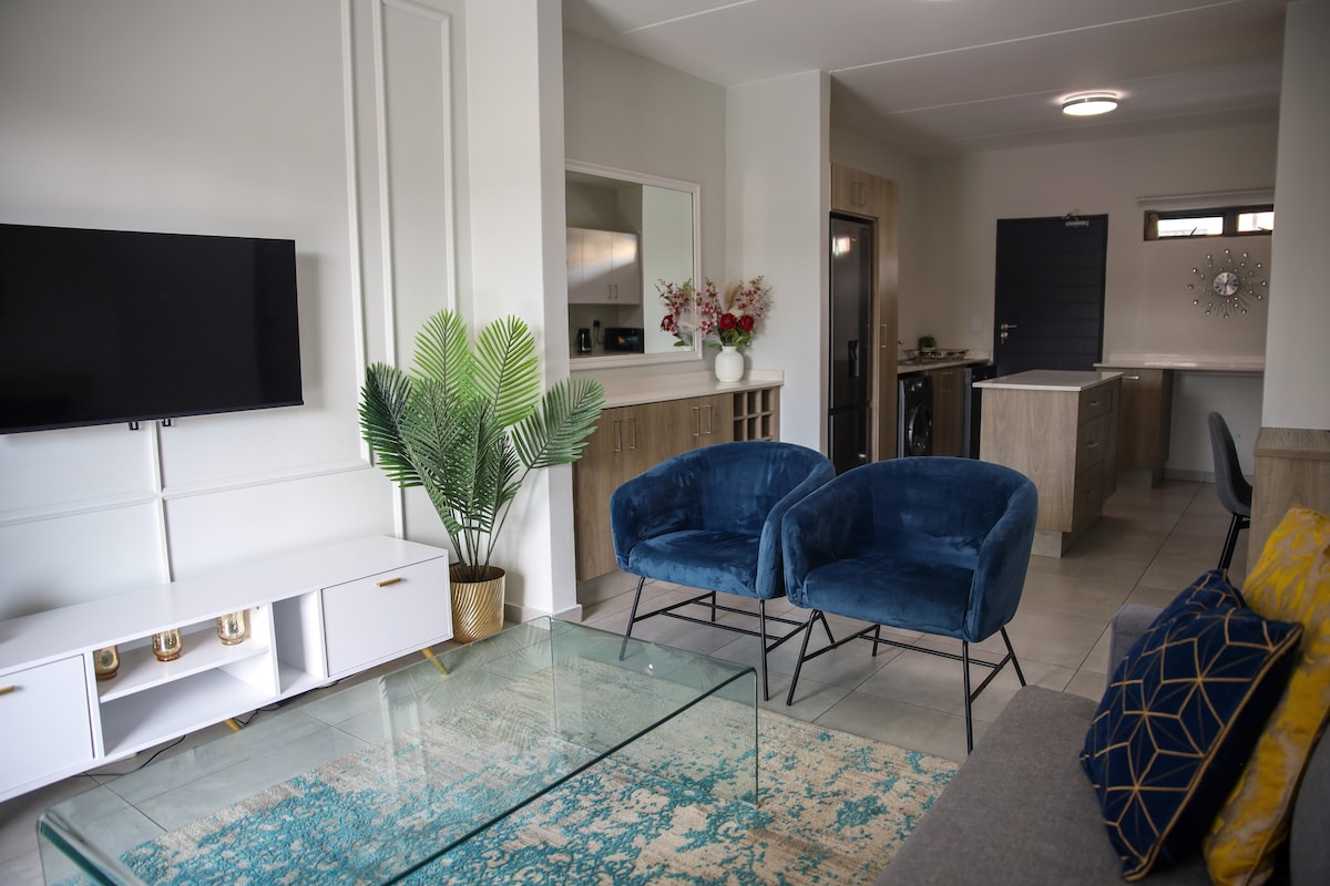 We welcome you to relax in our calm and luxurious space situated in a quiet section of Fourways. The apartment is uniquely and tastefully designed with amenities that radiate style and comfort. Treat yourself to this stunning apartment with a queen size bed, a fully equipped kitchen and a modern bathroom. Unwind on the patio or on the couch and enjoy a TV with Netflix and Youtube. The apartment has electricity backup that runs the TV and the Wi-Fi. Book your stay today and indulge in luxury.