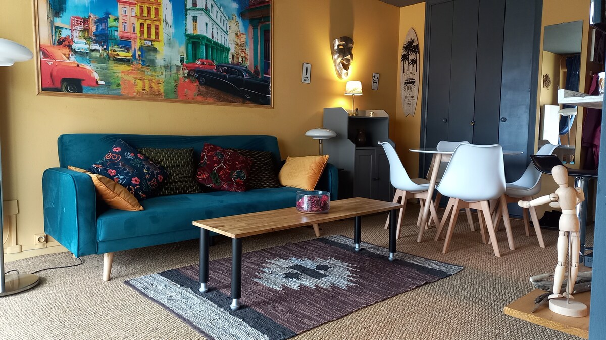 Appartement de très bon confort, en rez-de-jardin,de 3 pièces en parfait état de 46 m2,se composant de: un jardinet/terrasse de 30 m2, entièrement clos, au calme (se situe au fond d'une impasse), très bien exposé (orientation Sud Ouest),équipé d’une table de jardin,d’un parasol et de 2 transats. un salon:un grand canapé confortable,un meuble de salon avec poste TV,un autre meuble bas, une chaise pour bébé une cuisine ouverte sur le séjour, entièrement équipée: