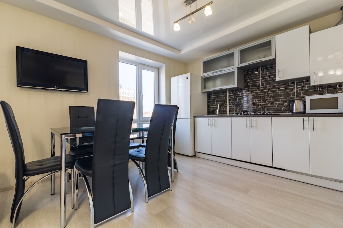 Πολυτελές διαμέρισμα στο κέντρο κοντά στο Most City. Κεντρική τοποθεσία, ιδιωτική αυλή, όπου μπορείτε να παρκάρετε το αυτοκίνητο. Οι εκλεπτυσμένοι εσωτερικοί χώροι, ο συνδυασμός φωτισμού, όμορφων επίπλων και εξοπλισμού μπορούν να ικανοποιήσουν ακόμα και τις πιο εκλεπτυσμένες γεύσεις. 8 χώροι ύπνου. Η κουζίνα είναι εξοπλισμένη με εντοιχισμένες συσκευές: φούρνο μικροκυμάτων, φούρνο, πλυντήριο ρούχων, ψυγείο, ηλεκτρικό βραστήρα. Τηλεόραση, διπλά κρεβάτια με ορθοπεδικό στρώμα, υψηλής ταχύτητας Υπάρχουν πολλές καφετέριες, καταστήματα, σούπερ μάρκετ, κινηματογράφος εδώ.