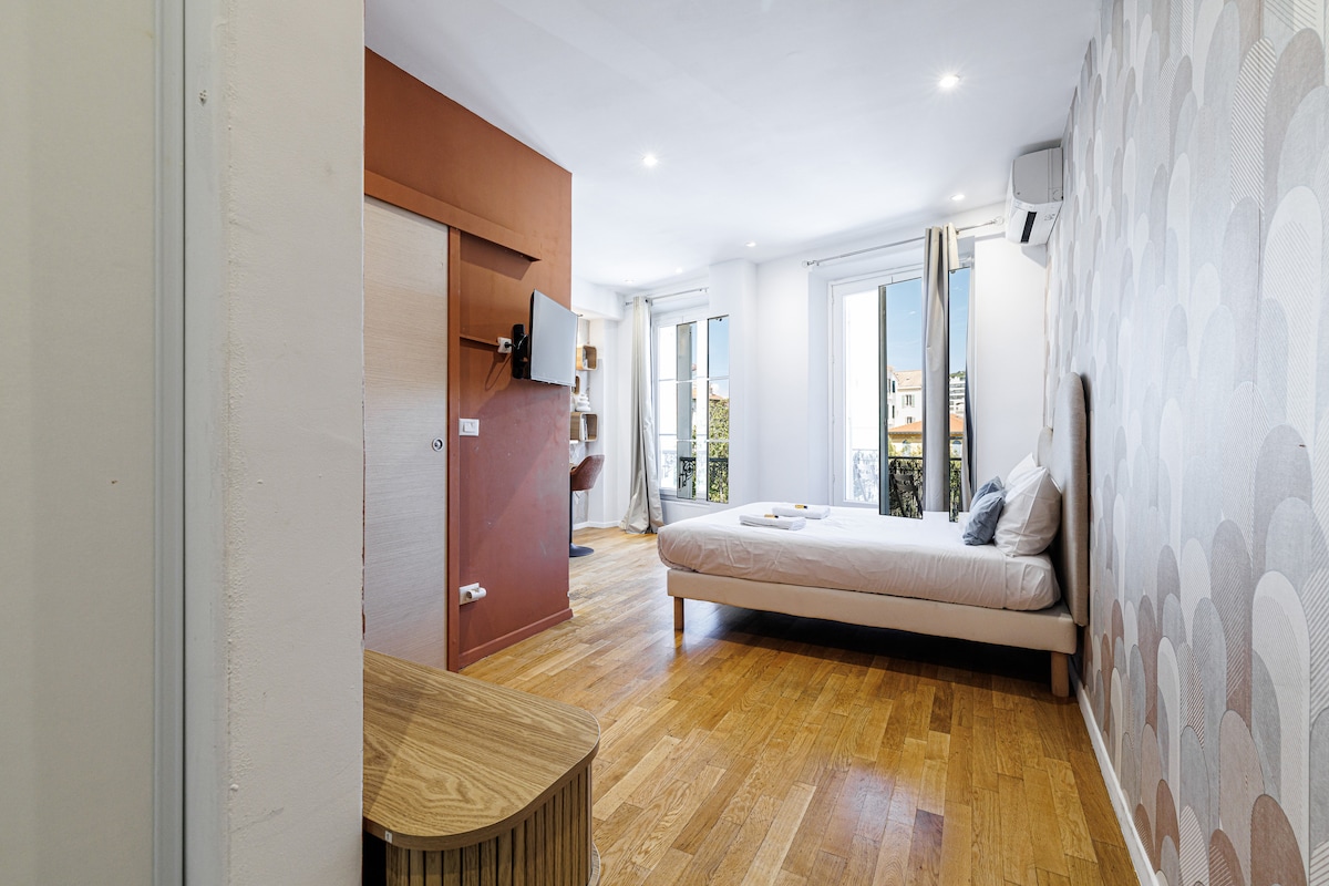 *Le Bourgeois* 3ème étage AVEC ascenseur. Venez profiter d'un moment hors du temps en posant vos valises dans ce logement situé dans un magnifique immeuble bourgeois cannois de 1930. Localisé au coeur de l'hypercentre de Cannes, cet appartement 3 pièces peut accueillir jusqu'à 4 voyageurs. Le Bourgeois a été entièrement rénové en 2024 pour vous apporter le confort nécessaire tout en conservant son charme & son authenticité. Voyagez léger, les linges de bain & lit sont fournis.