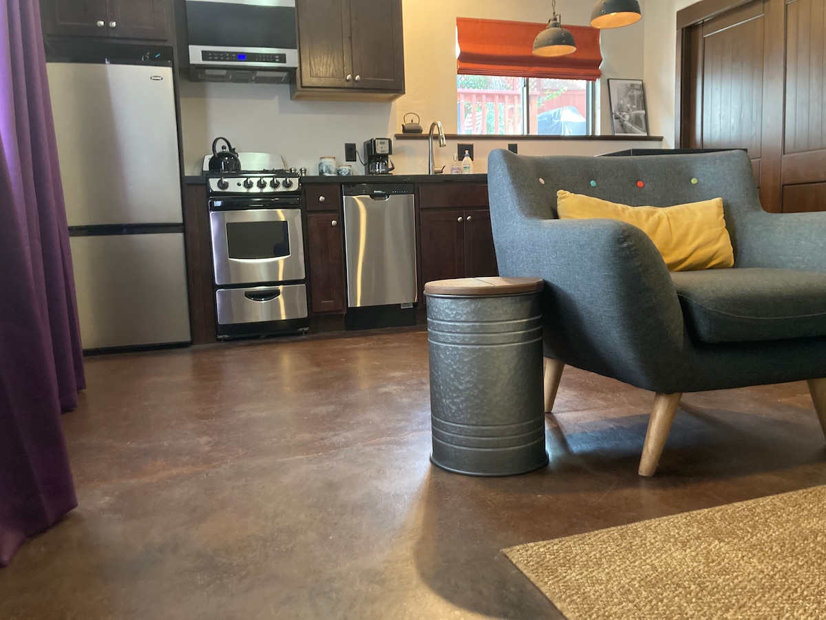 450 sq foot studio with radiant heat, full kitchen, queen bed, blackout curtains, window A/C Private, detached building. No pets For long term rental we’ll get you started with a generous supply of toiletries, TP, dish soap, laundry detergent coffee, then guest is responsible Parking: Both short and long term: free parking on driveway