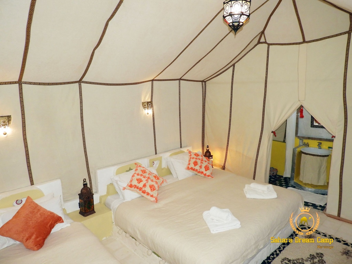 Μπροστά στους αμμόλοφους Erg Chebbi, αυτή η κατασκήνωση είναι το ιδανικό μέρος για να χαλαρώσετε και να νιώσετε τη μαγεία της ερήμου και τη σιωπή της νύχτας κάτω από τα αστέρια. Δεν θα θέλετε να φύγετε από αυτόν τον γοητευτικό, μοναδικό χώρο. Βρίσκεται στους αμμόλοφους και μπορεί κανείς να απολαύσει τόσο την ανατολή όσο και το ηλιοβασίλεμα από την κορυφή των αμμόλοφων. Όλες οι σκηνές μας περιλαμβάνουν ιδιωτικό μπάνιο. Επίσης, θα μπορείτε να απολαύσετε ένα παραδοσιακό πρωινό και δείπνο στο εστιατόριό μας. Θα απολαύσετε επίσης τη φωτιά με παραδοσιακή μουσική από Βερβέρους