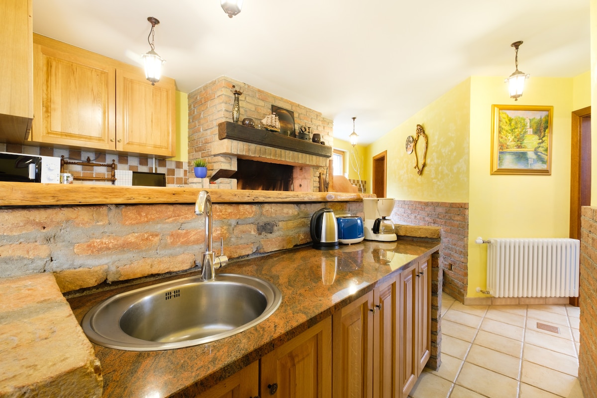 Our beautiful estate is located cca 40 km from Zagreb, in Zagorje, one of the most colourful regions of continental Croatia. Estate lies on a wonderful 2.000 m2 piece of land and is full of extraordinary plants, trees and flowers. Orientation of the estate is SW-W which gives the guests both - a lot of sun during the day and an astonishing view with the sunset. Three main points of the estate are main villa, swimming pool and rustical guest house. Main villa is surrounded by the two spacious terraces that enter the ground floor with dining table for ten, nice, fully equiped kitchen and a huge living room with the fire place. Bella Vista corner with five comfortable armchairs is situated on a west part of the ground floor - the view and the sunset are breathtaking! On the first floor one can find the master bedroom with the huge terrace, nice jacuzzy bathroom and a smaller room with a pull- out sofa for two. On the second floor there is another bedroom with double bed, bathroom with the massage shower, and a lobby with an antique writing table and pull out soffa for two. Swimming pool is 8,5 x 4,5 m, equipped with the swimming machine and the solar shower. The swimming pool is open from 1.5.-15.10. Guest house is close to the swimming pool. It's a rustic house with the large porch. It has a kitchen, bathroom, living room, and a very nice bedroom on the second floor that overlooks the swimming pool. The estate is situated in a very quiet and relexing area full of small cities, villages with domestic food products and historical castles. At the same time it is very close to Croatian capital Zagreb (30 minutes by car), to Croatian seaside (less than two hours by car) or to Plitvice lakes (90 minutes by car). COOKING Daily cooking,cleaning service can be additionaly organised by our Nada who is very good in preparing domestic specialities. Come and enjoy! This is a real paradise in any time of the year!