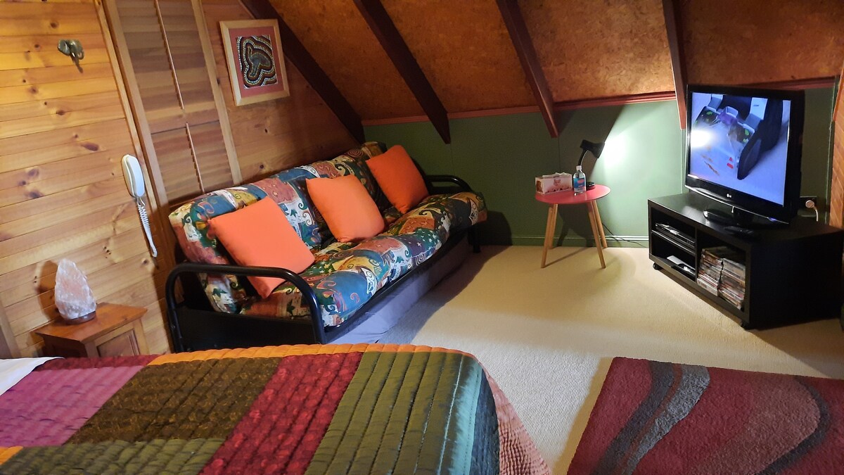 Dunroamin is an A frame style house on 8.5 Rural acres .Our house is in a peaceful leafy location which overlooks the Hunter Valley & Tangory Mountain . The upper floor is your private accommodation & is a bright room with a unique style. We also include a hearty breakfast with a choice of options.