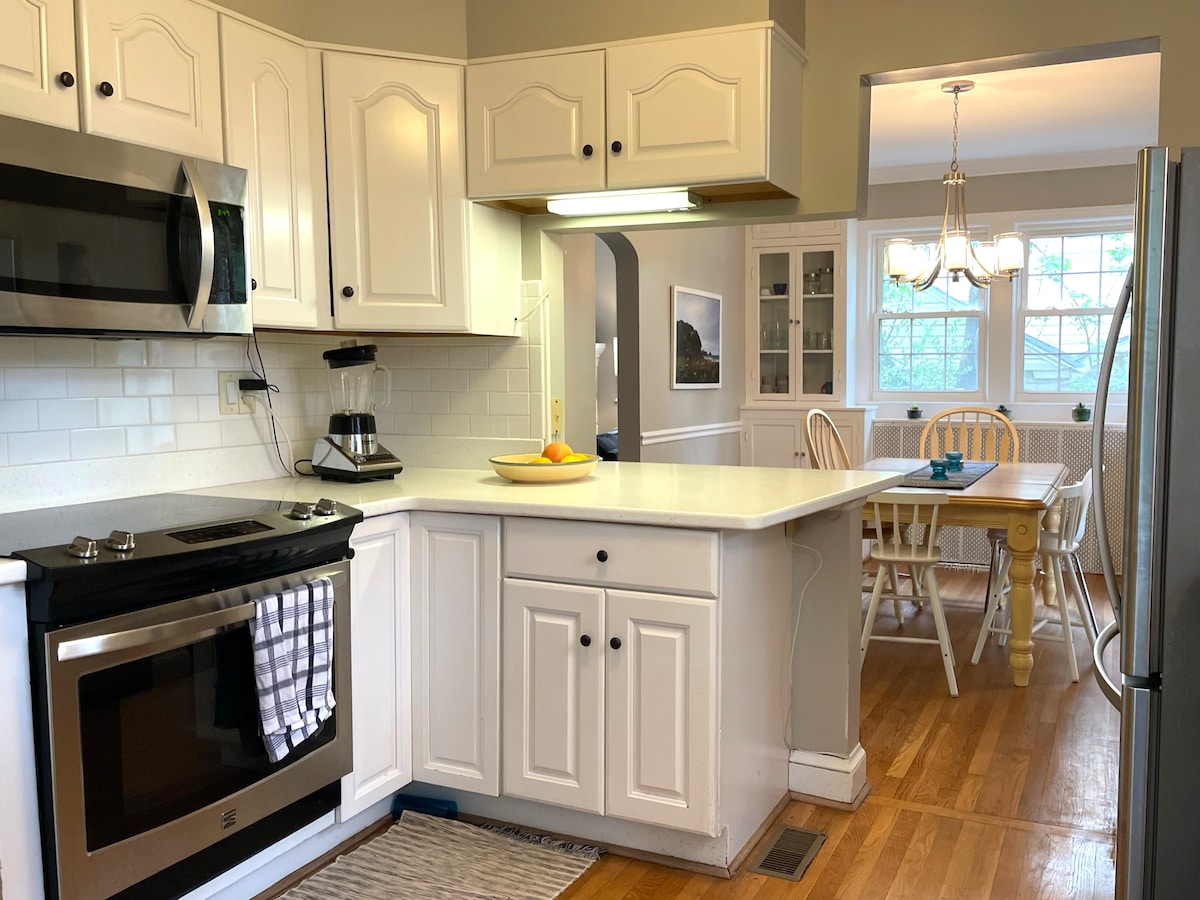 This apartment with its own private entrance sits below our brick Cape Cod-style home. The unit is totally refurbished with luxury amenities. It's a cozy bohemian cottage vibe with a touch of Miyazaki anime magic. Open floorplan includes a fully stocked kitchen with dishwasher (and new Nespresso!) plus a separate sleeping room with comfy king-sized bed and a private bathroom with a large walk-in shower. Off-street parking, fast internet, & sofa bed for extra guests. No smoking inside, please.