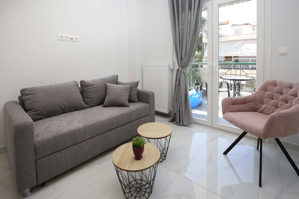Unique 1 Bedroom fully equipped apartment on the seventh floor of a 2020 renovated building with a breathtaking terrace balcony. High speed internet, premium amenities, a luxurious queen size bed, and your very own Netflix account are but a few things we offer you. Luminous, spacious, with everything you might require to enjoy your stay in the heart of Thessaloniki's social life, only 5 minutes away from Aristotelous square and 2 minutes from the seafront. Welcome and enjoy your stay!
