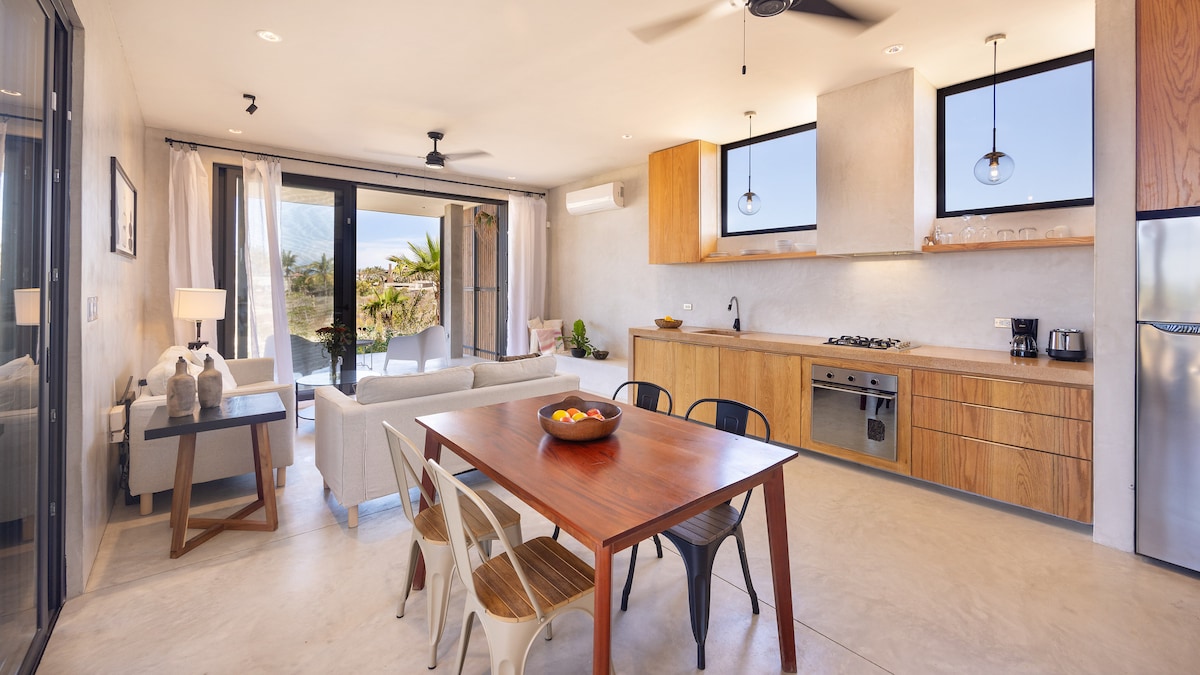 Casa Cardones blends minimalist elegance and sustainability, harmonizing perfectly with the desert landscape. Its chukum walls, natural wood accents, and large windows connect the interior with nature, offering privacy without disconnecting from the surroundings. The open spaces, along with the terrace and rooftop, provide unique views and relaxing moments under the stars. Every detail reflects comfort and respect for the environment, creating an experience in tune with the desert.