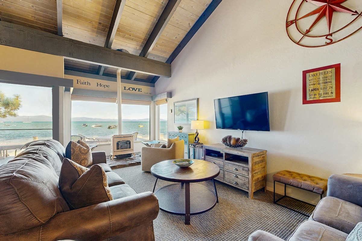 Αυτό το όμορφα ανακαινισμένο διαμέρισμα μπροστά στη λίμνη διαθέτει εκπληκτική θέα, σύγχρονες ανέσεις και βρίσκεται σε μια ήσυχη κλειστή κοινότητα με ιδιωτική παραλία λίγα βήματα από την πόρτα σας. Αυτή η πανέμορφη ιδιοκτησία είναι ιδανική για διακοπές στην παραλία, οικογενειακές εκδρομές για σκι ή για μια οικεία απόδραση ζευγαριών στον ορεινό παράδεισο της λίμνης Τάχο. Το σπίτι περιλαμβάνει τρία υπνοδωμάτια, τρία πλήρη μπάνια, μια πρόσφατα ανακαινισμένη κουζίνα, δύο τζάκια αερίου για χαλαρωτικές νύχτες και δύο ηλιόλουστα μπαλκόνια με υπέροχη θέα.
