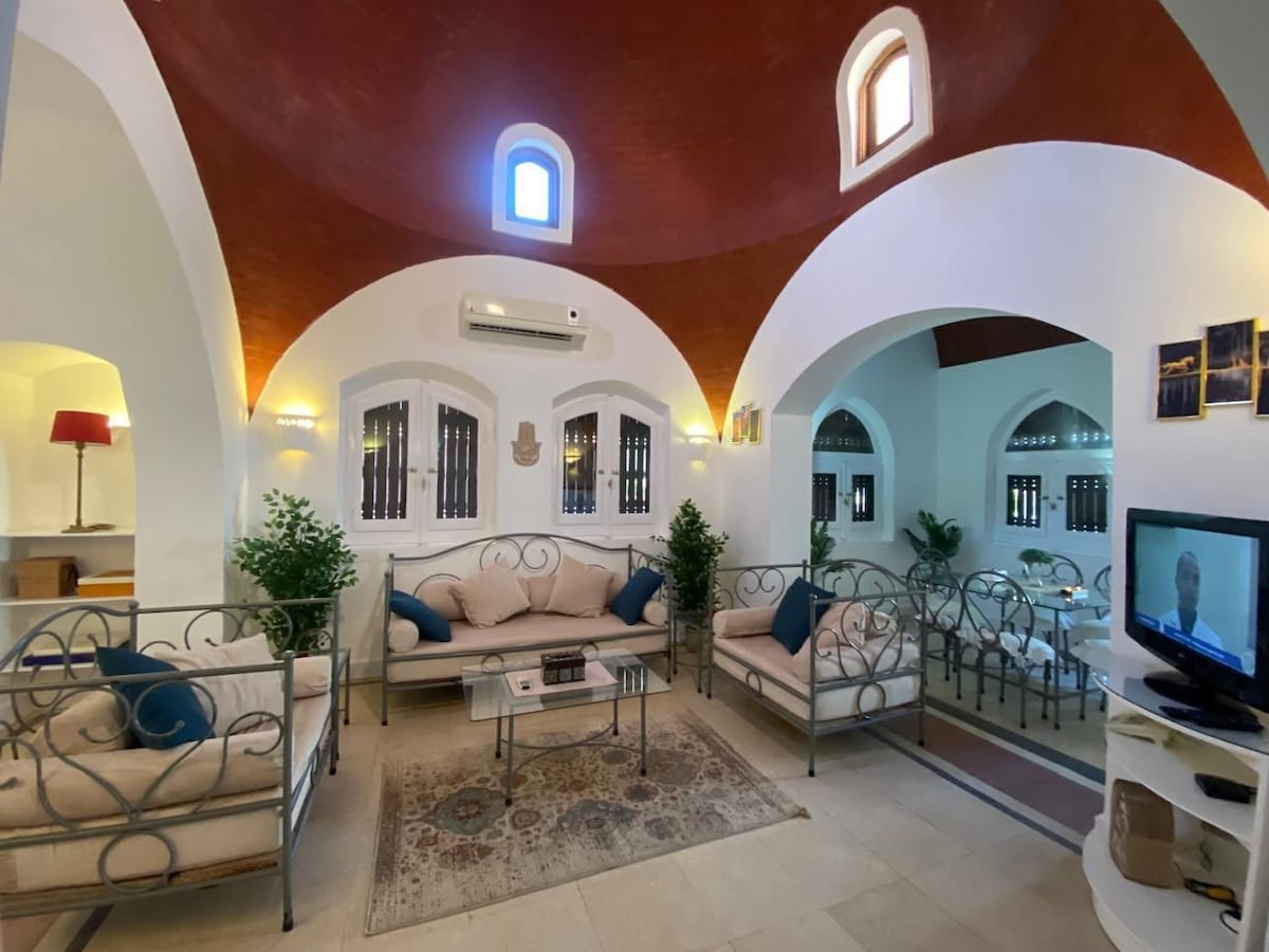This Eclectic 2 bedroom twin house sleeps 7 guests and is located at Gouna's elite community of Tawila. NOTE: ALL guests must submit their IDs 48 hours before check-in for Gouna QR code gate entry. (If disapproved by community security, the guest should initiate the cancellation and will receive a full refund). NOTE: According to community rules, Egyptian couples are required to provide marriage certificate, Foreign nationalities do not need a marriage certificate