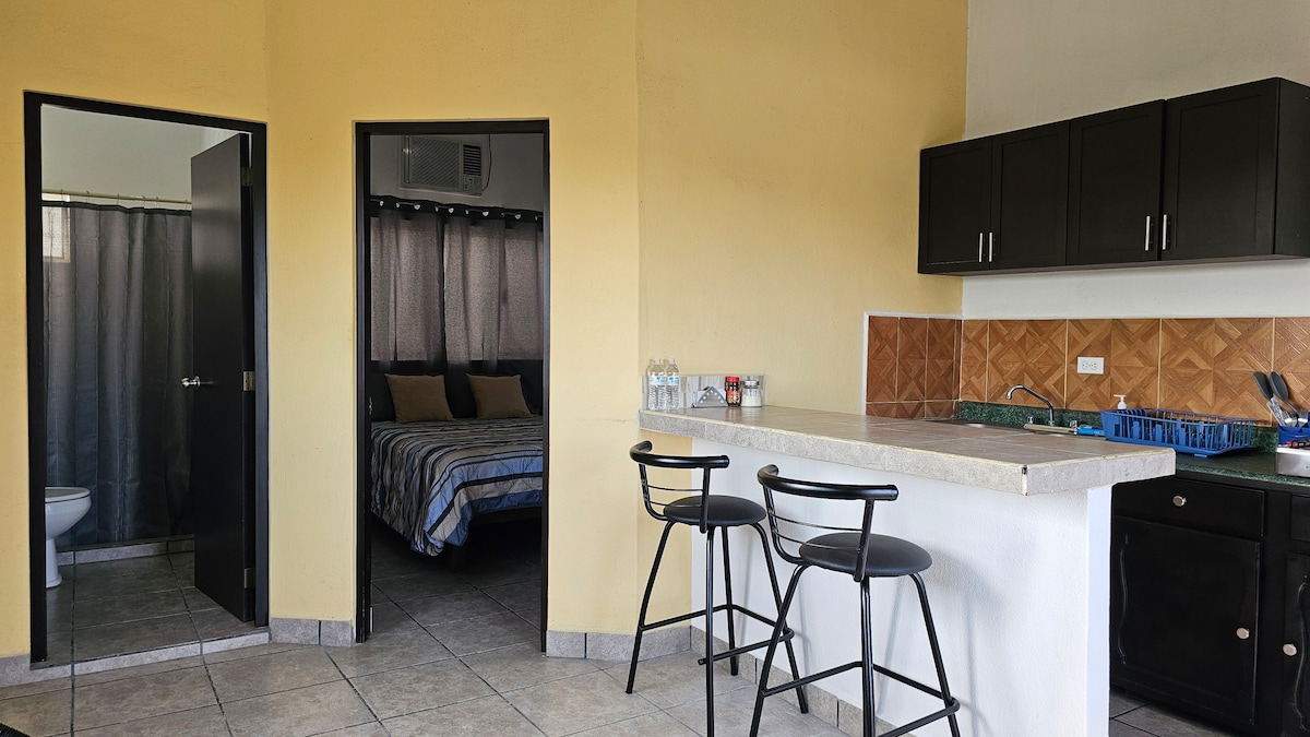 Estudio amueblado, zona céntrica y tranquila, estacionamiento sobre la misma calle o en terreno de junto. Con Aire Acondicionado, ventilador de techo, WiFi, ROKU TV, cama queen, refrigerador, microondas, cafetera, tostador, estufa, vajilla, tarja, cubiertos y artículos para cocinar, patio de servicio con lavadero. A 10 minutos caminado del centro histórico de San José, 5 minutos en auto de centro comercial, de playa y zona turística. Fácil y rápido acceso a vías principales y transporte público.