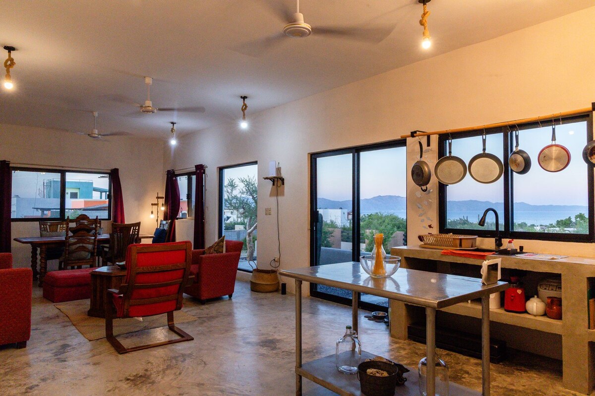 Το "Baja Luna" βρίσκεται ανάμεσα στα βουνά και τη θάλασσα. Ξυπνήστε μέχρι την ανατολή του ηλίου πάνω από τη Θάλασσα του Κορτέζ και το νησί Jacques Cousteau. Το σούρουπο, ανεβείτε στο κατάστρωμα του τελευταίου ορόφου και παρακολουθήστε το ηλιοβασίλεμα να φωτίζει τα βουνά Sierra Cacachilas. Πριν κοιμηθείτε, δείτε τη μαγική ανατολή του φεγγαριού πάνω από τη θάλασσα — και τα αστέρια να αναβοσβήνουν στον σκοτεινό ουρανό. Θα απολαύσετε δύο ιδιωτικούς ξενώνες δίπλα σε αίθριο και θερμαινόμενη πισίνα. Η ιδιοκτησία είναι ιδανική για δύο ζευγάρια, εργένηδες ή μικρές οικογένειες.