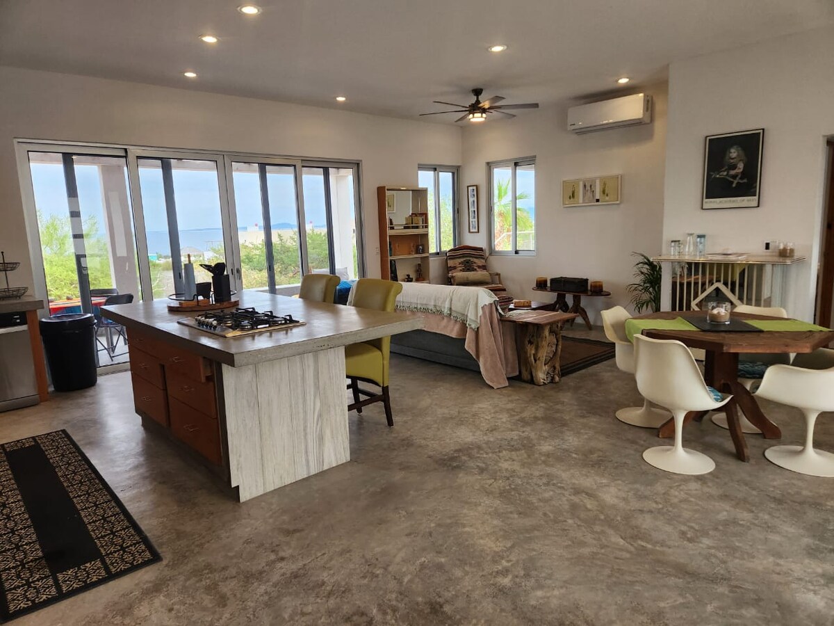 Ένα άνετο οικολογικό καταφύγιο με 2 κρεβάτια, 1 μπάνιο με πλήρη κουζίνα, πάγκο πρωινού και σαλόνι που ανοίγει σε μια ευρύχωρη επιπλωμένη βεράντα, πισίνα, τζάκι και επική θέα στη θάλασσα. Απολαύστε πρωινό καφέ, ζωντανά δείπνα, χαλαρώστε στη βεράντα, βουτήξτε στην ιδιωτική σας πισίνα και ξυπνήστε με θέα στην ανατολή. Μια πεμπτουσία εμπειρίας Baja με άνεση και ευκολία. Αρκετά κοντά για περιπέτεια, αρκετά μακριά για ξεκούραση, μόλις 7–10 λεπτά από την πόλη, παραλίες, kitesurf, θαλάσσια σαφάρι, καφετέριες, θερμές πηγές, MTB. Γρήγορο Starlink WiFi.