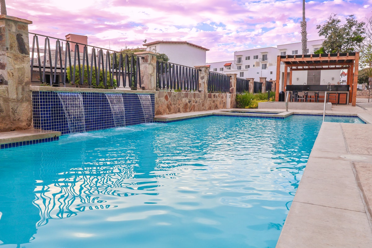 Απολαύστε ένα όμορφο διαμέρισμα! Με όμορφα ηλιοβασιλέματα και θέα που θα απολαμβάνετε κάθε στιγμή! Από το μπαλκόνι σας ή μέσα στο ιδιωτικό τζακούζι! Θα έχετε όλα όσα χρειάζεστε για να δημιουργήσετε οικογενειακά, ρομαντικά ή ομαδικά περιβάλλοντα! Έχετε πρόσβαση στα τέσσερα παιχνίδια με τραπέζι μπιλιάρδου 🎱 και επιτραπέζια παιχνίδια για όλους! Και φυσικά η πισίνα όπου μπορείτε να απολαύσετε ένα νόστιμο ψητό κρέας ή απλά να χαλαρώσετε στο κρεβάτι σας! Αν θέλετε να διασκεδάσετε, αυτό είναι το κατάλληλο μέρος!