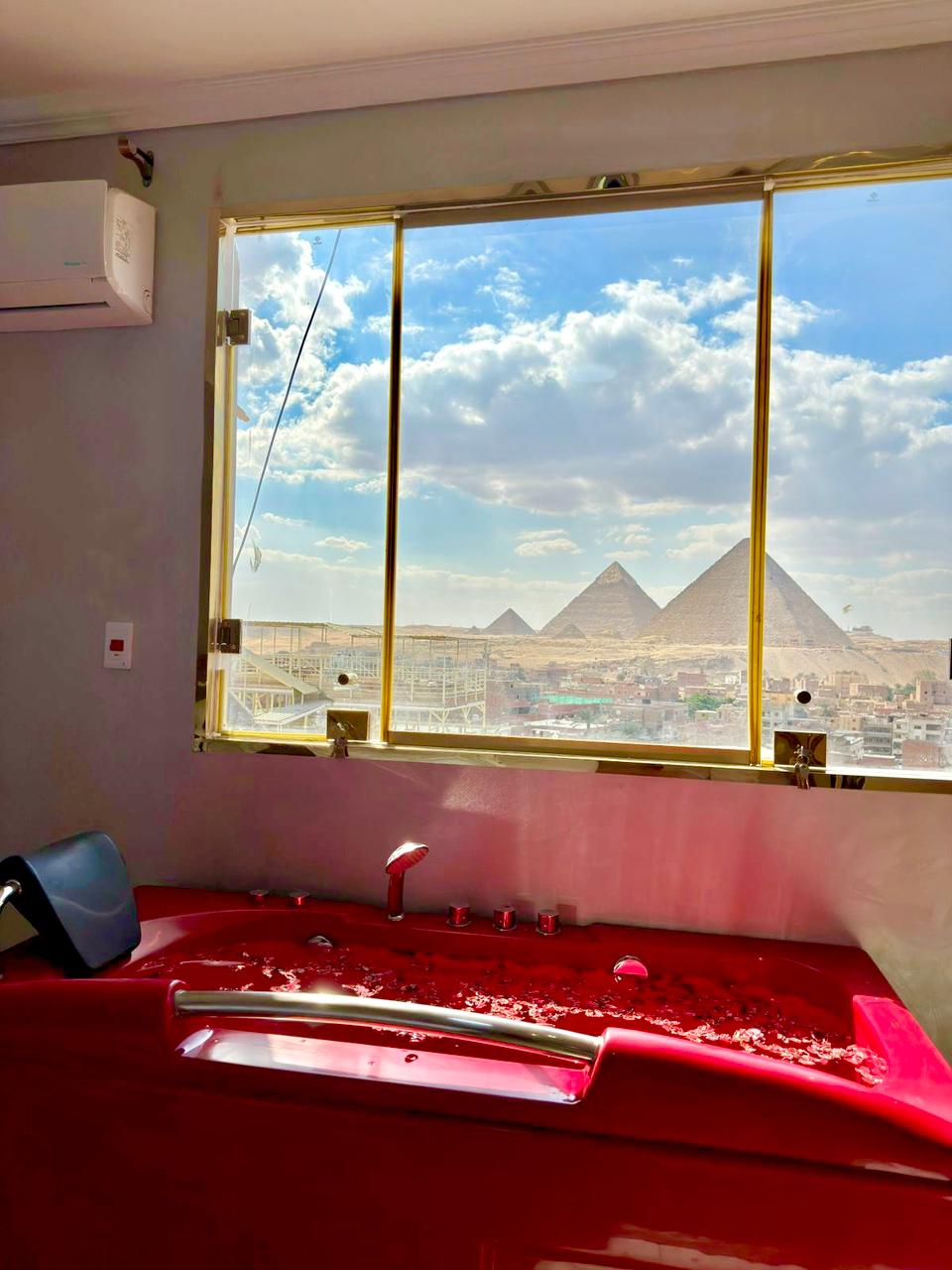 Ξυπνήστε στις πυραμίδες! Το πολυτελές 440 τετραγωνικά πόδια Το δωμάτιο με τζακούζι σας περιμένει, μόλις 5 λεπτά από τις πύλες. Χαλαρώστε σε ένα υπέρδιπλο κρεβάτι, ετοιμάστε ένα σνακ στη μικρή κουζίνα σας και, στη συνέχεια, απολαύστε το ιδιωτικό τζακούζι διπλής θέσης, ενώ ατενίζετε αρχαία θαύματα. Τα εκλεκτά σεντόνια και η μοντέρνα επίπλωση αναβαθμίζουν τη διαμονή σας. Άφιξη μετά τις 2 μ.μ., αναχώρηση έως τις 12 π.μ. Ιδανικό για ζευγάρια που θέλουν μια αξέχαστη απόδραση στην Αίγυπτο.