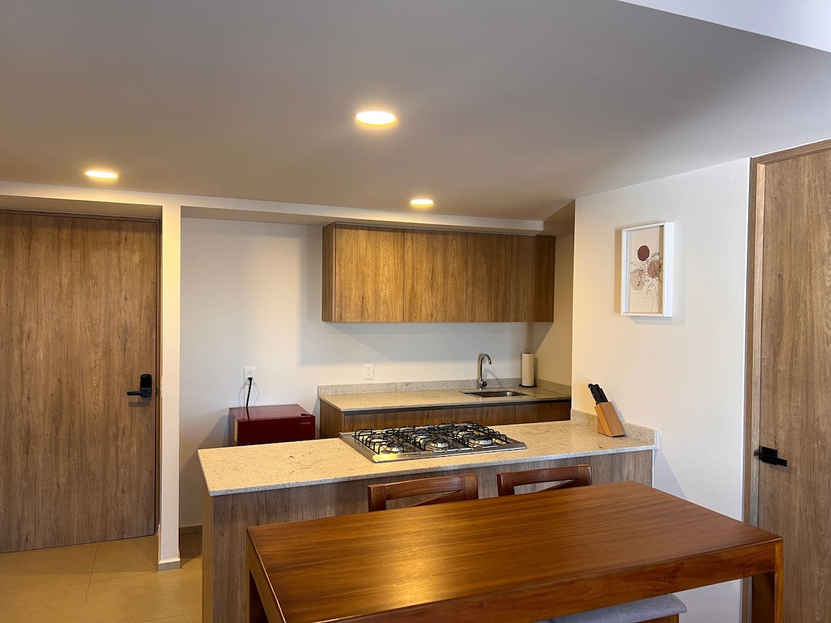 Πολυτελές διαμέρισμα στη Γκουανταλαχάρα, διακοσμημένο από το γραφείο FNisino και με έπιπλα φτιαγμένα κατά παραγγελία από ντόπιους τεχνίτες. Μείνετε σε ένα από τα πιο αποκλειστικά και νέα κτίρια στην Providencia, κοντά στην οικονομική ζώνη, το δάσος Colomos, το Punto Sao Paulo και μόλις 10 λεπτά από το Andares. Εξαιρετικά άνετος χώρος, ο οποίος διαθέτει όλες τις παροχές και θα σας κάνει να έχετε μια απίστευτη διαμονή. Διαθέτει ασφάλεια 24 ώρες το 24-ωρο, πισίνα, γυμναστήριο, συνεργατικό χώρο και δικό του πάρκινγκ.