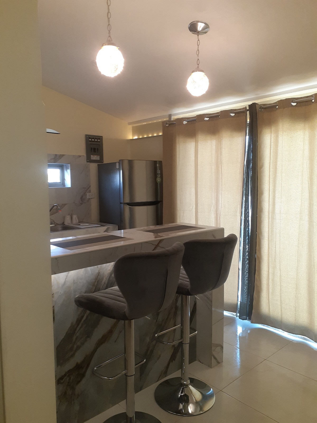 Éste elegante Depa esta dentro de una casa amplia y moderna, es ideal para viajes en familia, eventos y negocios, se ubica en el segundo piso, incluye: - Cama Queen (2 personas) - Sofácama 1 - Baño exclusivo - Cocineta - Cafetera, micro (suministros) - Smart TV - Escritorio - Maletero - Comedor PLANTA BAJA: - Lobby (área común) - Patio y jardín - Salón de eventos (bajo reserva) - Estacionamiento (solicitar disponibilidad) PLANTA ALTA: - Vestíbulo - Cocina - Cuarto de lavado y planchado