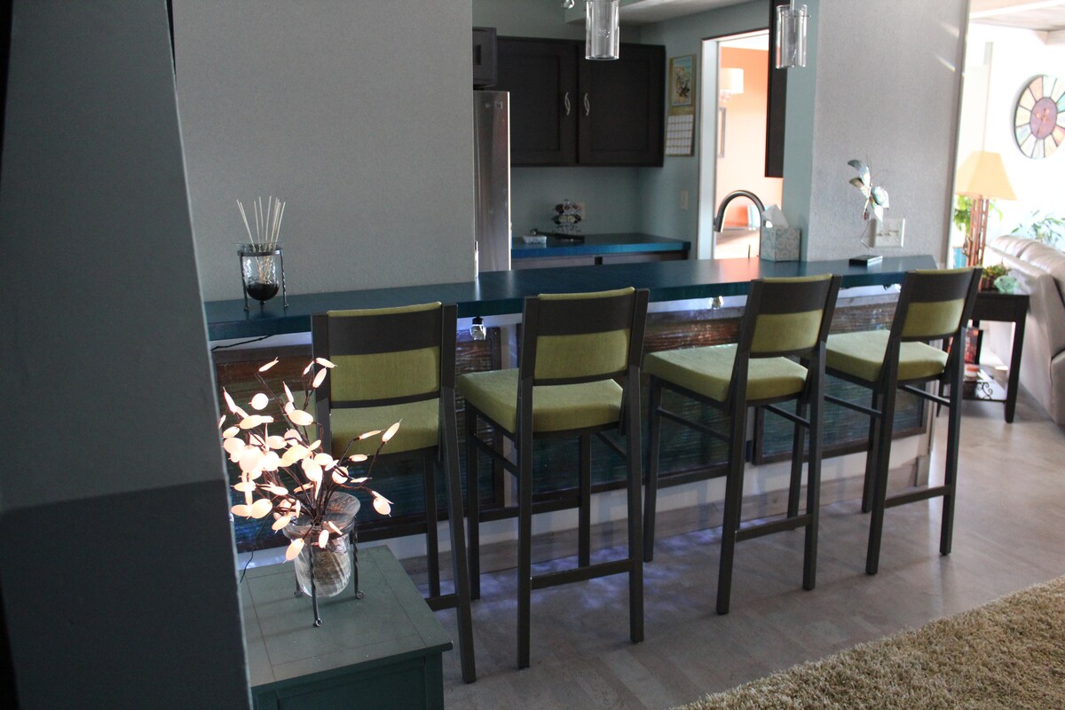 Χαλαρώστε σε αυτόν τον ήρεμο, κομψό χώρο. Πρόσφατα ανακαινισμένο με διακόσμηση σε παραθαλάσσιο στιλ. Γρανίτες πάγκοι και νησίδα στην κουζίνα με σκαμπό μπαρ για 6 άτομα. Σταθμός καφέ Keurig με αυτόματο φωτισμό κάτω από τον πάγκο. Ευρύχωρος νεροχύτης κουζίνας με αποσπώμενο στεγνωτήριο, επιφάνεια κοπής και δοχείο πλυσίματος λαχανικών/φρούτων. Πλυντήριο και στεγνωτήριο σε στοίβα με πλήρη χωρητικότητα. Δοχείο υγρού σαπουνιού στην ντουζιέρα. Παρέχονται μαντηλάκια μακιγιάζ. Σταθμός φόρτισης και WiFi. Πρίζες φόρτισης σε όλα τα κομοδίνα.