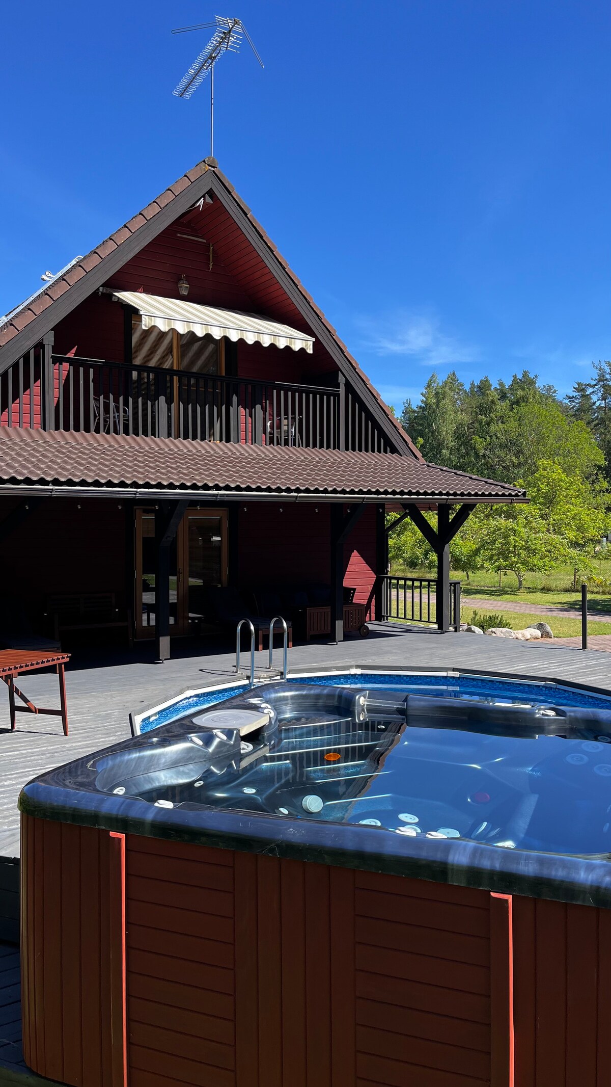 Warm jacuzzi at cozy wooden house with a pool