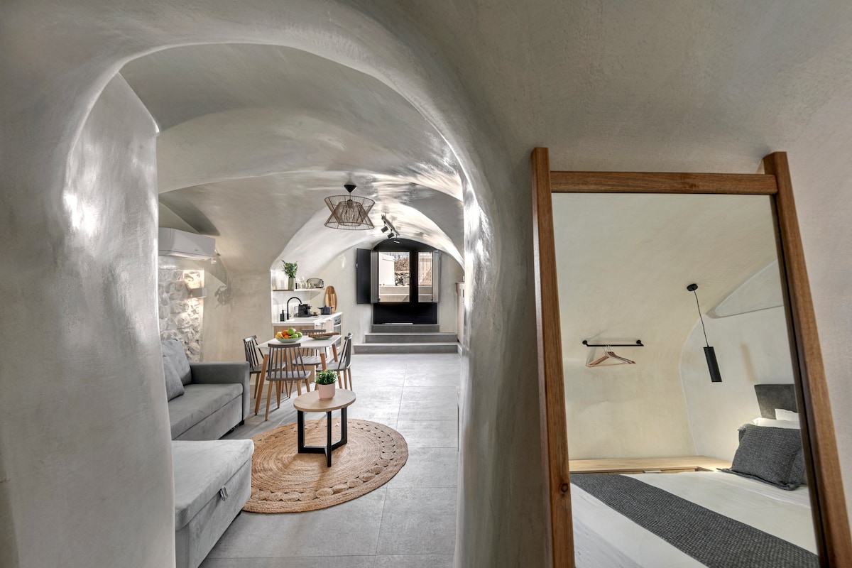 Located in the very heart of Oia, at a secluded position on the famous caldera of Santorini, Oia Spirit is a stylish complex of 8 stand-alone traditional cave houses, with access to a shared cave pool. This suite additionally features a private outdoor plunge pool. The view from its terrace is stunning, featuring the caldera and the two iconic blue domes of Oia. Santorini International Airport is about 17 km from Oia Spirit, and the Ferry Port at approximately 23 km.