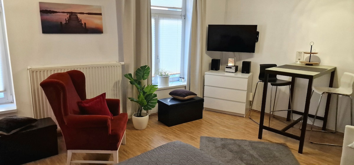 Δύο άνετα και κλιματιζόμενα υπνοδωμάτια σε εξοχικό στιλ (επιπλέον κλιματιζόμενο δωμάτιο με καναπέ-κρεβάτι και μικρή κουζίνα για τους επισκέπτες) και ευρύχωρα μπάνια για 1-6 άτομα με χώρο στάθμευσης και Wi-Fi σε μια ήσυχη νέα περιοχή. Το κέντρο της πόλης απέχει μόλις 1500 μέτρα, ο σιδηροδρομικός σταθμός 1600 μέτρα, η έξοδος του αυτοκινητόδρομου 3 λεπτά. Οι σκύλοι είναι ευπρόσδεκτοι επισκέπτες, σε περίπου 100 μέτρα ξεκινάει η πράσινη ζώνη με όμορφα μονοπάτια για περπάτημα. Ιδανικό επίσης για ποδηλάτες και για τζόκινγκ. Χωρίς πρωινό!