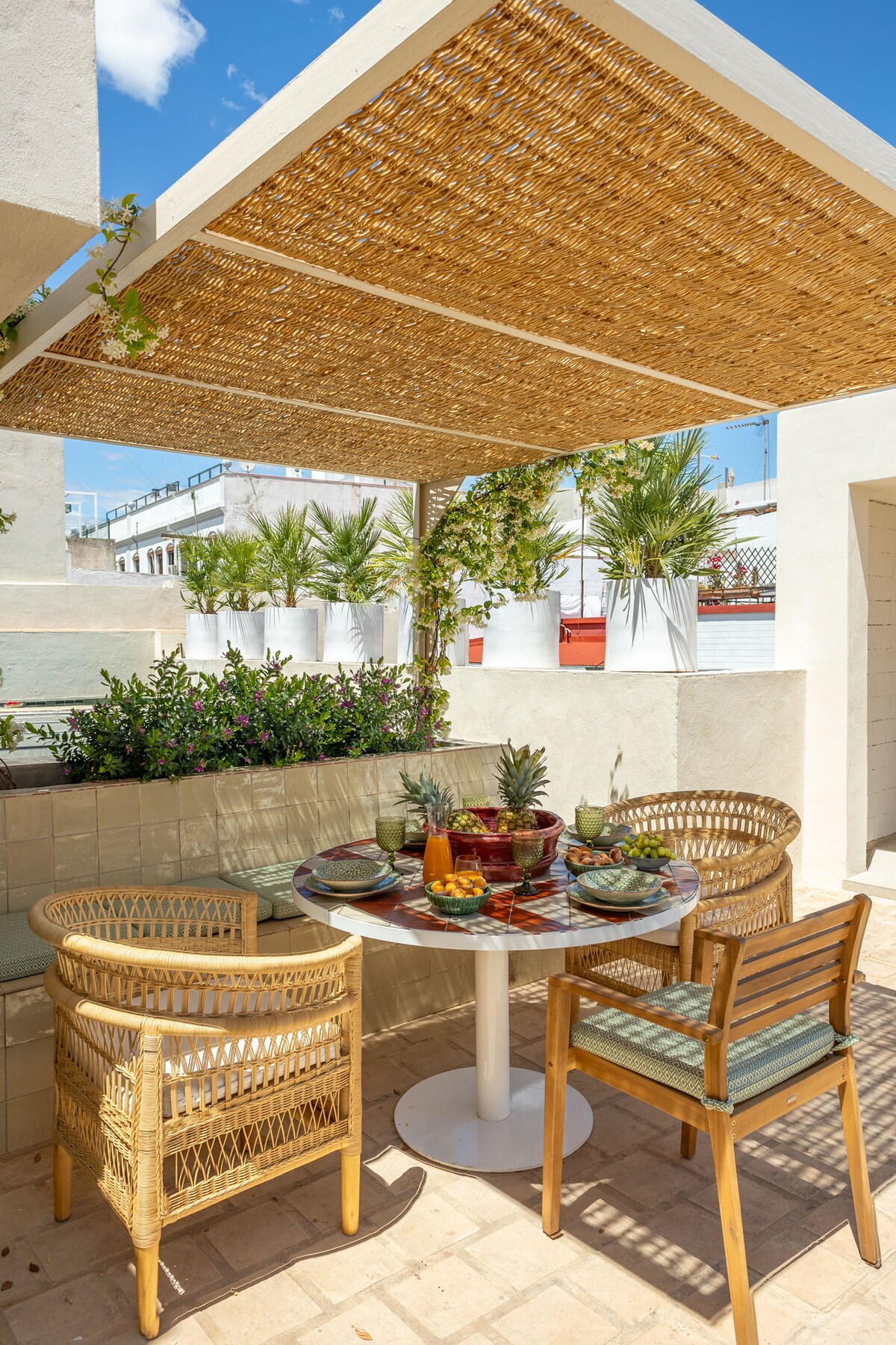 Unwind in a luxurious, modern, and eclectic house with a private pool, nestled in the historic Roman and Arabic area of Aljarafe. Just 15 minutes 11 km from Seville's vibrant downtown, this spacious, high-end home is your perfect retreat. Savor a cup of tea in the stunning private rooftop garden, thoughtfully designed with bespoke furniture by local artisans. The sophisticated interior blends modern elegance with urban flair, offering impeccable style. Enjoy year-round dips in your private pool!
