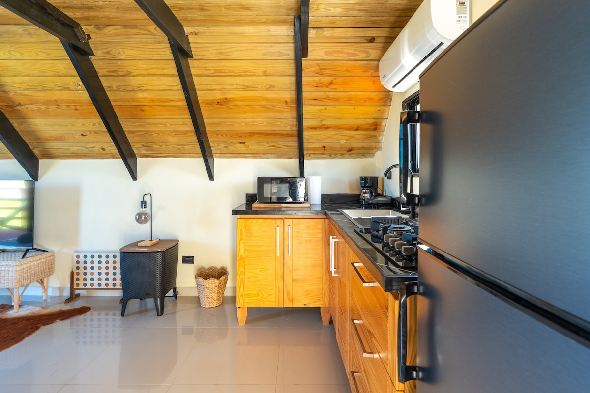 Το σπίτι μας, 46 τ.μ., φωλιασμένο ανάμεσα σε πανύψηλα δέντρα και μόλις 20 μέτρα από την ιδιωτική σας είσοδο στο Río de Yásica, προσφέρει έναν αρμονικό συνδυασμό σύγχρονης άνεσης και φυσικής ομορφιάς. Η προσεκτικά σχεδιασμένη κυβική δομή μεγιστοποιεί τον χώρο και την άνεση, με μια ανοιχτή διάταξη που ενσωματώνει άψογα το υπνοδωμάτιο, το σαλόνι, την κουζίνα και το μπάνιο, δημιουργώντας μια ευρύχωρη και φιλόξενη ατμόσφαιρα. Τα μεγάλα παράθυρα προσφέρουν εκπληκτική θέα στο δάσος και το ποτάμι, συνδέοντάς σας με τον φυσικό κόσμο.