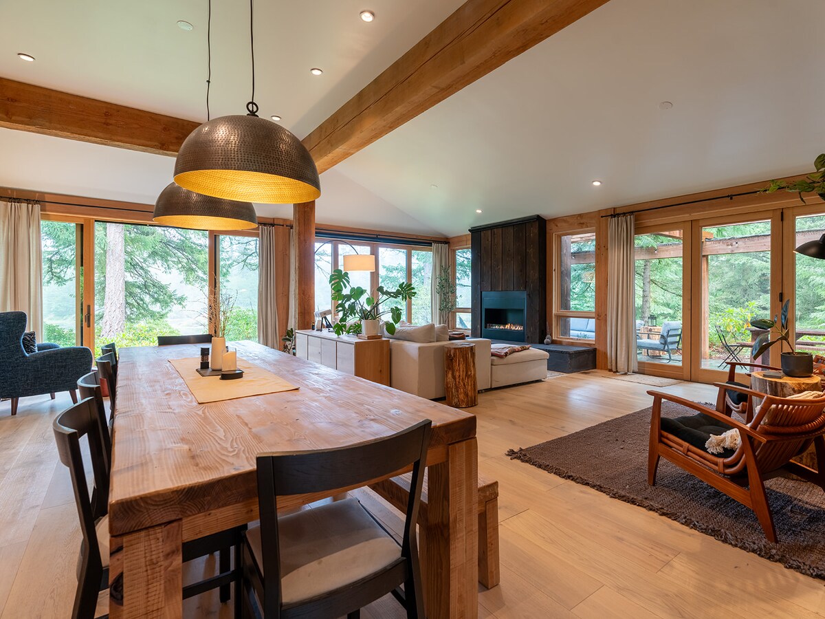 Αποδράστε στο πολυτελές ορεινό σπίτι μας που βρίσκεται σε 20 στρέμματα δάσους με άγρια ζωή. Απολαύστε 2000 τετραγωνικά πόδια σε ένα απομονωμένο περιβάλλον με πλήρη θέα στο Όρος Hood. Ιδιωτικό σκεπαστό αίθριο 2500 τετραγωνικών ποδιών με μπάρμπεκιου. Κουζίνα και τραπεζαρία που ρέει μέσα από έναν κινητό τοίχο παραθύρου για εσωτερική/εξωτερική διαβίωση. Αίθουσα πολυμέσων με ηλεκτρικά ανακλινόμενα καθίσματα με κλιμακωτά καθίσματα θεάτρου. Πλυντήριο. 10 λεπτά από εστιατόρια, διασκέδαση ή ψώνια. 45 λεπτά από το Όρος Hood (σκι, πεζοπορία, καγιάκ). Καναπές-κρεβάτι στο δωμάτιο πολυμέσων. Διαθέσιμη κουκέτα