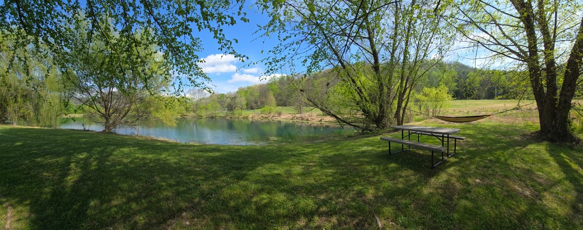Escape to Station Camp Getaway, a luxury A-Frame home in Irvine, Kentucky, where peaceful valley views, privacy, and comfort create a memorable stay. Soak in the hot tub, unwind in the infrared sauna, enjoy the gym, gather around the fire pit, play pool or ping pong, and spend time by the private stocked fishing pond with pedal boat. Perfect for couples, families, and small groups, this is a place to reconnect, recharge, and enjoy a peaceful countryside escape.