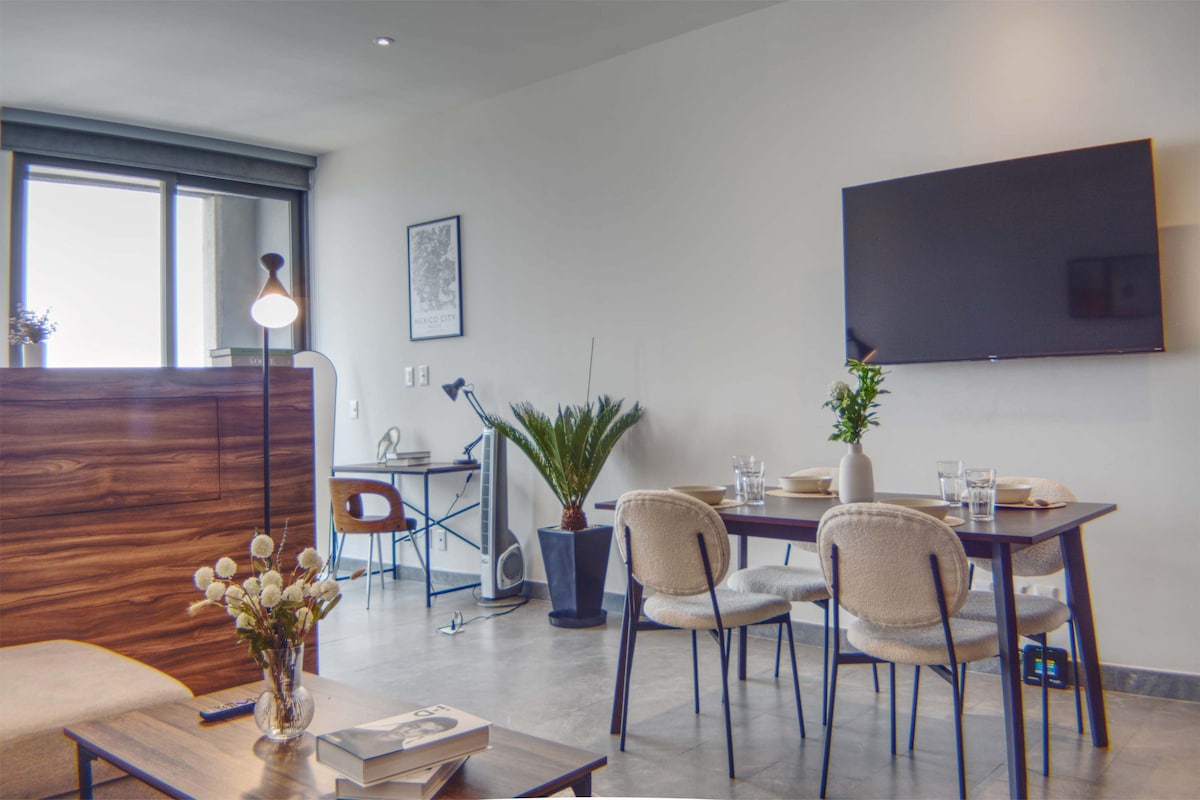 Αυτό το πολυτελές διαμέρισμα στον 36ο όροφο του BeGrand Reforma προσφέρει άνεση και στιλ στην καρδιά της Πόλης του Μεξικού. Το κύριο υπνοδωμάτιο διαθέτει ένα ευρύχωρο κρεβάτι King Size με στρώμα αφρού μνήμης και κορυφαία σεντόνια. Θα βρείτε επίσης ένα πρακτικό γραφείο για χρήση στο γραφείο του σπιτιού και ένα ιδιωτικό μπαλκόνι με εκπληκτική πανοραμική θέα στο εμβληματικό Μνημείο της Επανάστασης.