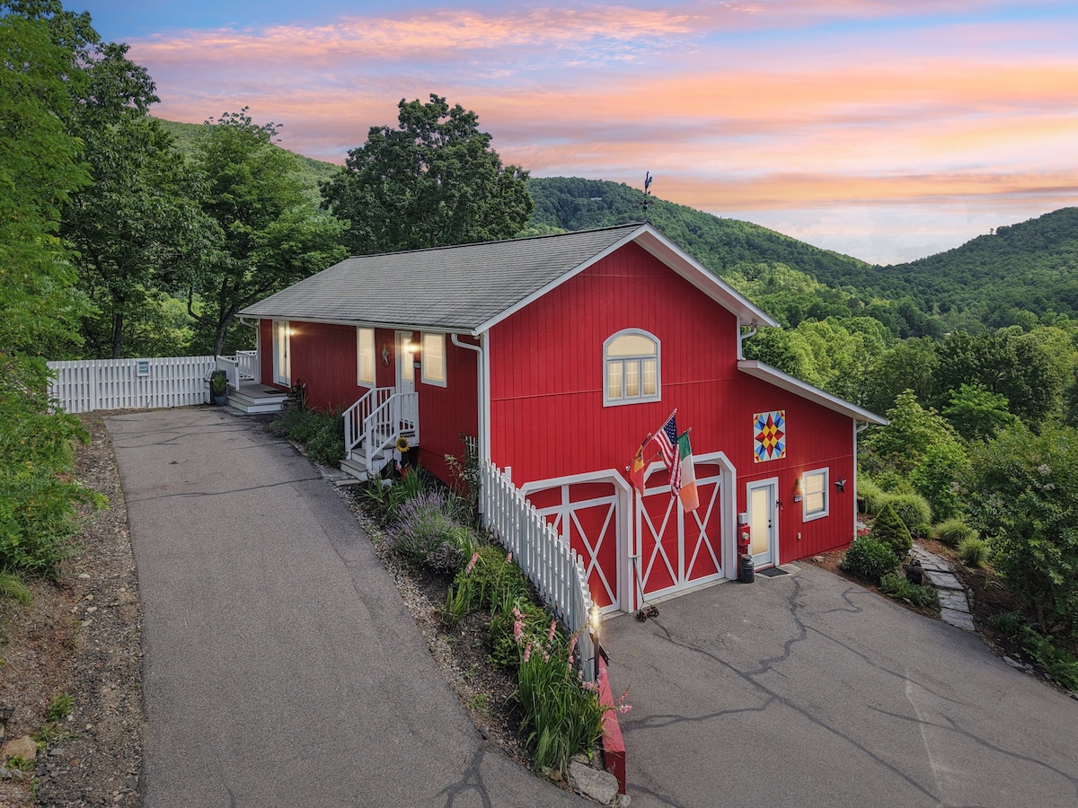 Wake up inside a storybook Red Barn perched above the Blue Ridge with panoramic mountain views from every window and your private hot tub waiting under open skies. Two King suites, a chef's kitchen, a wood-burning fire pit, and a spacious deck with a grill make this a true four-season escape. Just 20-25 mins to Asheville's Biltmore Estate, yet completely tucked away. Pure mountain magic awaits.